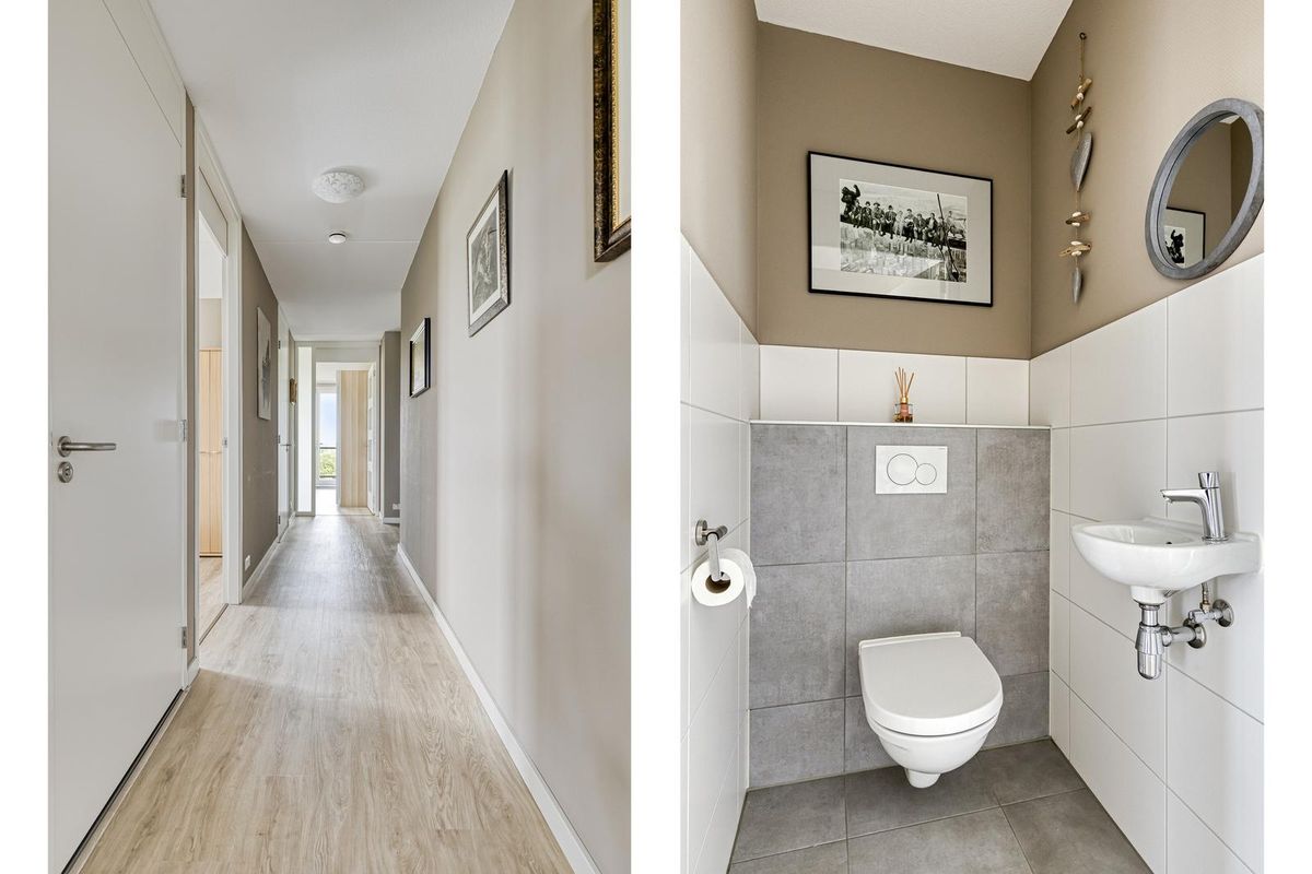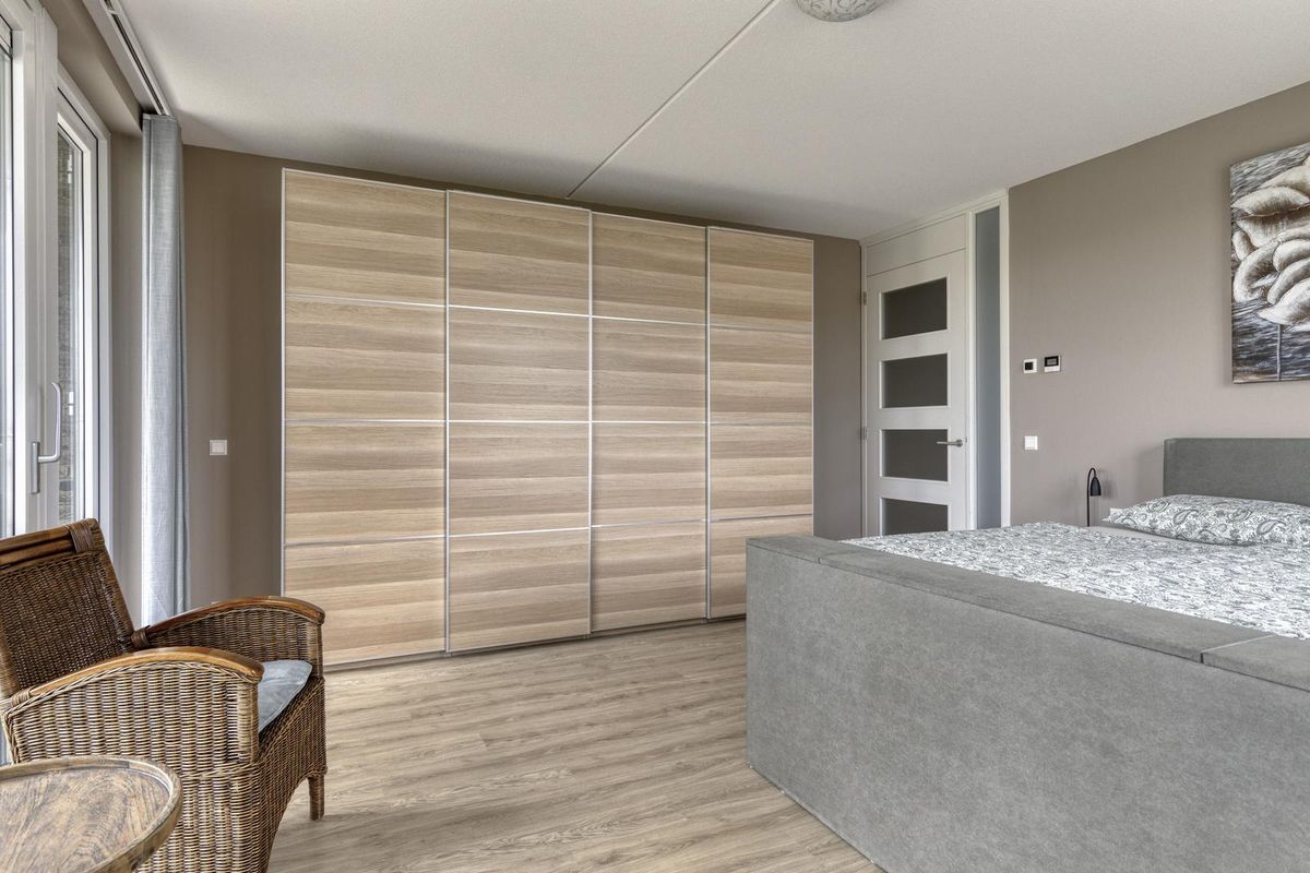 Rechts van de hal bevindt zich de master bedroom, voorzien van een schuifpui met rolhordeur en toegang tot het balkon op het oosten. Screens aan de buitenzijde en luxe raamdecoratie zorgen hier voor comfort en privacy. De tweede slaapkamer ligt tegenover de hal. De badkamer is luxe en tijdloos afgewerkt met een douche, tweede toilet, ruime wasmeubel en vloerverwarming. Ook is er een separaat gastentoilet en een praktische berging aanwezig voor extra opbergruimte, een ruime voorraadkast en de witgoedaansluitingen zijn hier aanwezig.