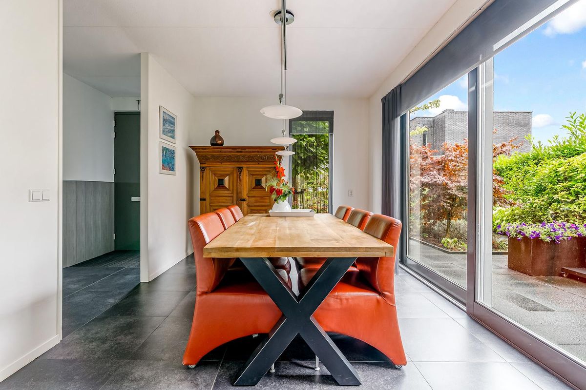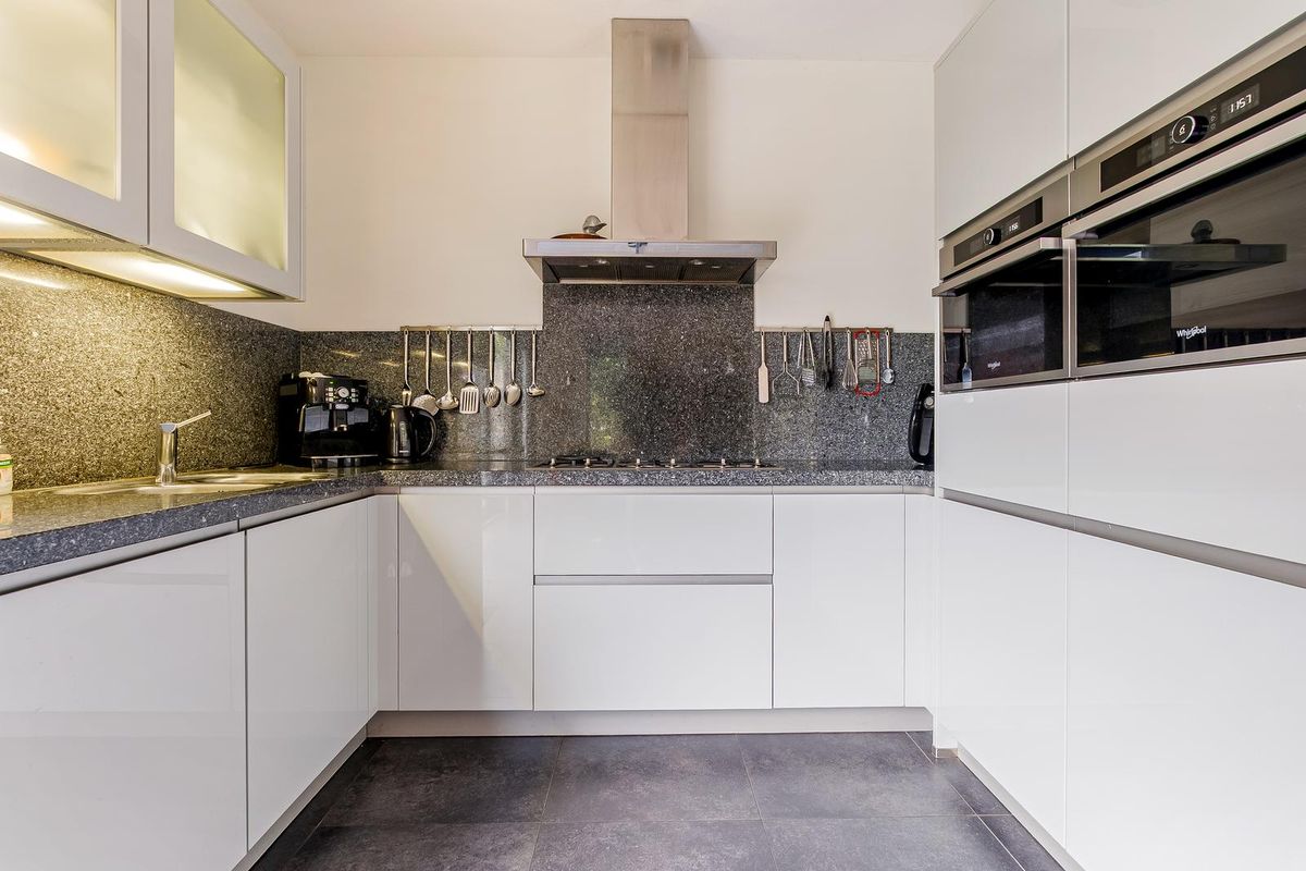 Ruime woonkamer van ca. 43,6 m² met vloerverwarming en veel lichtinval en openslaande deuren naar het terras van 25,1 m² aan het water. Eetgedeelte met moderne keuken (ca. 19,2 m²) met o.a. vaatwasser (AEG), 2× combimagnetron (Whirlpool, 2020), gaskookplaat (Smeg, 2012) en koelkast (Smeg, 2012).