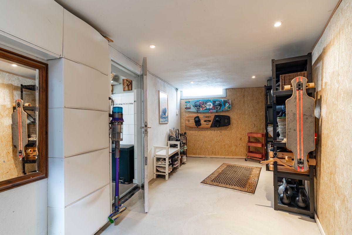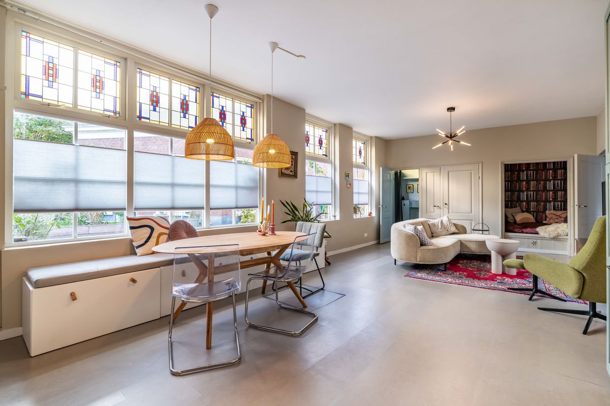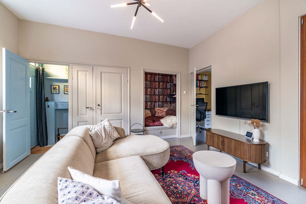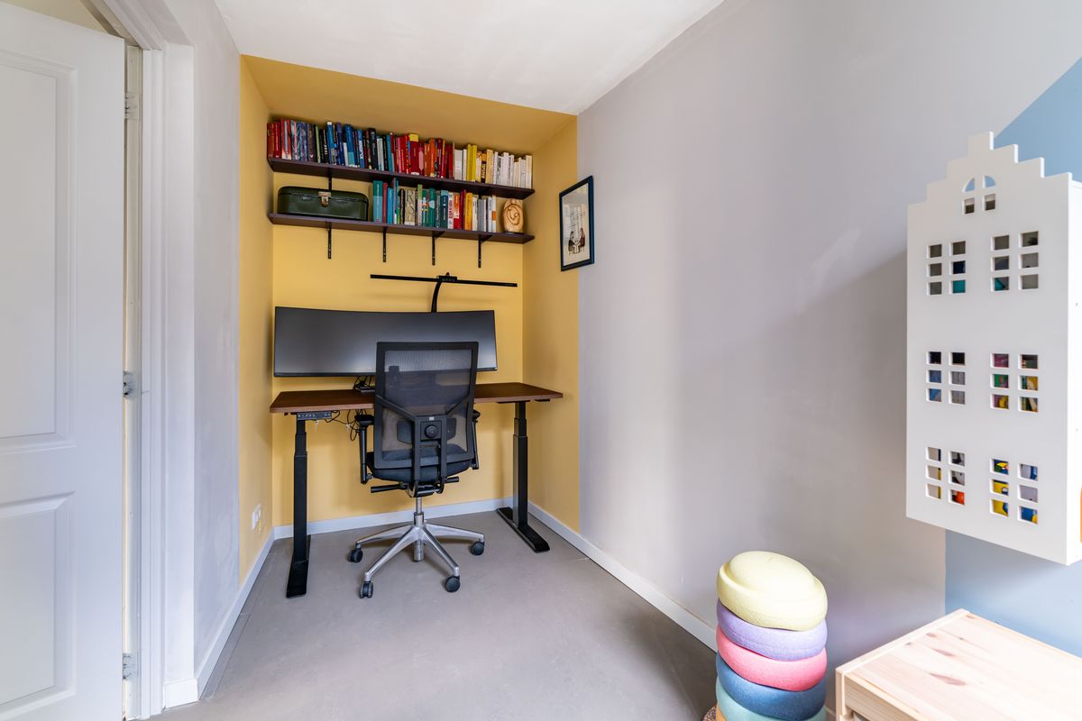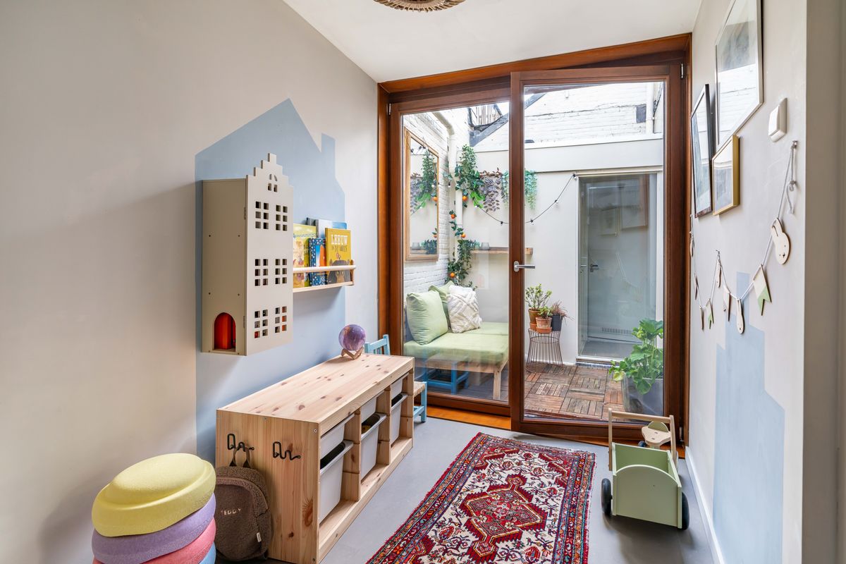 Heerlijke lichte woonkamer met vloerverwarming en een duurzame marmoleum vloer, charmante uitkijk op het pleintje en de muurschildering aan de overkant. Originele bedstede onder de trapopgang - typisch voor Scheveningen - ideaal als chillplek. In de ruimte onder de bedstede bevindt zich nog een kelder. Er is een aparte kamer die nu in gebruik is als studeer,-/speelkamer. Zowel vanuit de woonkamer als de studeerkamer toegang tot de patio waar je heerlijk een kopje koffie drinkt met een goed boek.