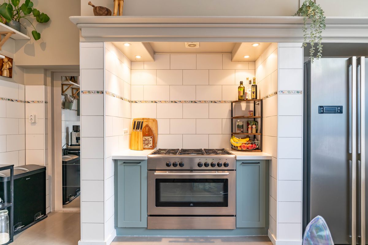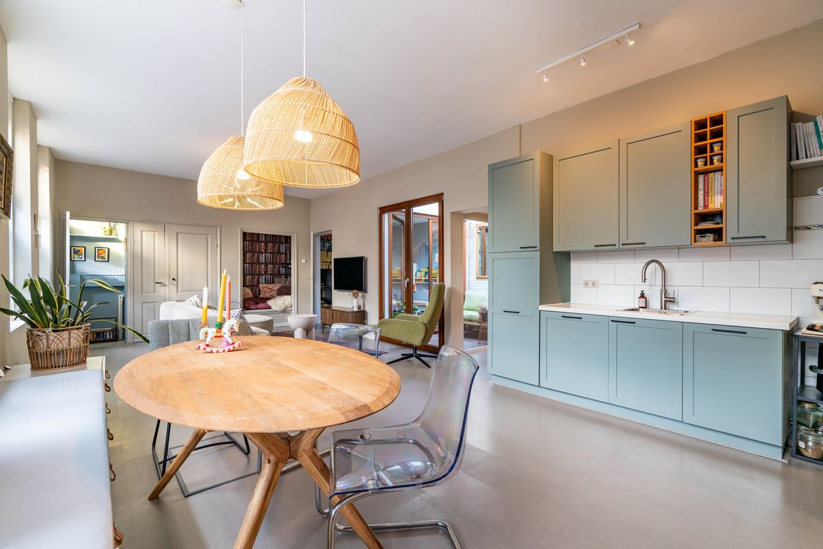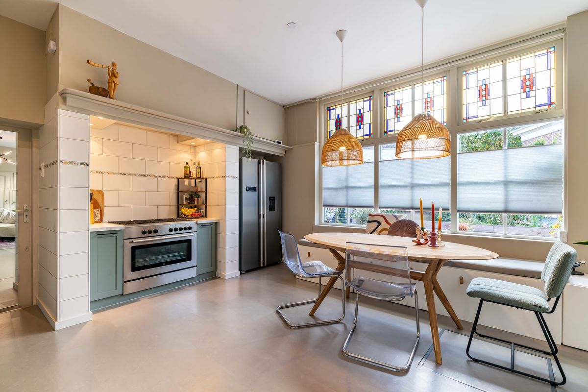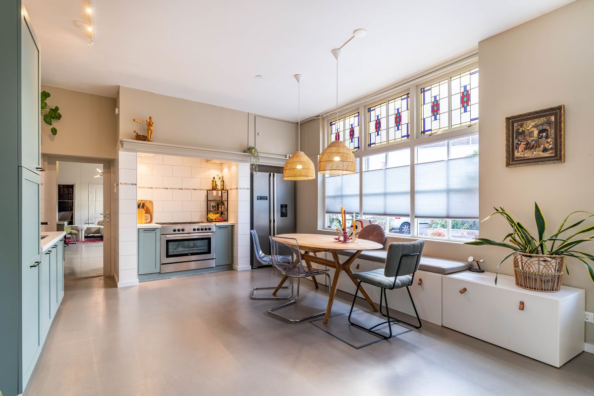 Riante open woonkeuken met een sfeervol kookgedeelte onder de oude schouw, voorzien van een groot fornuis en oven, en daarnaast ruimte voor de koel-/vriescombinatie. Aan de linkerzijde flink wat berg- en werkruimte en het spoelgedeelte met Quooker. Vanuit de keuken doorgang naar de bijkeuken, deze is rondom geïsoleerd en kan bijvoorbeeld als berging voor de bakfiets of surfplank worden gebruikt. Dankzij de eigen toegang vanaf buiten kan de bijkeuken ook zo als kantoor aan huis worden gebruikt.