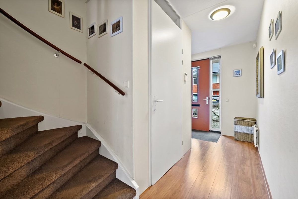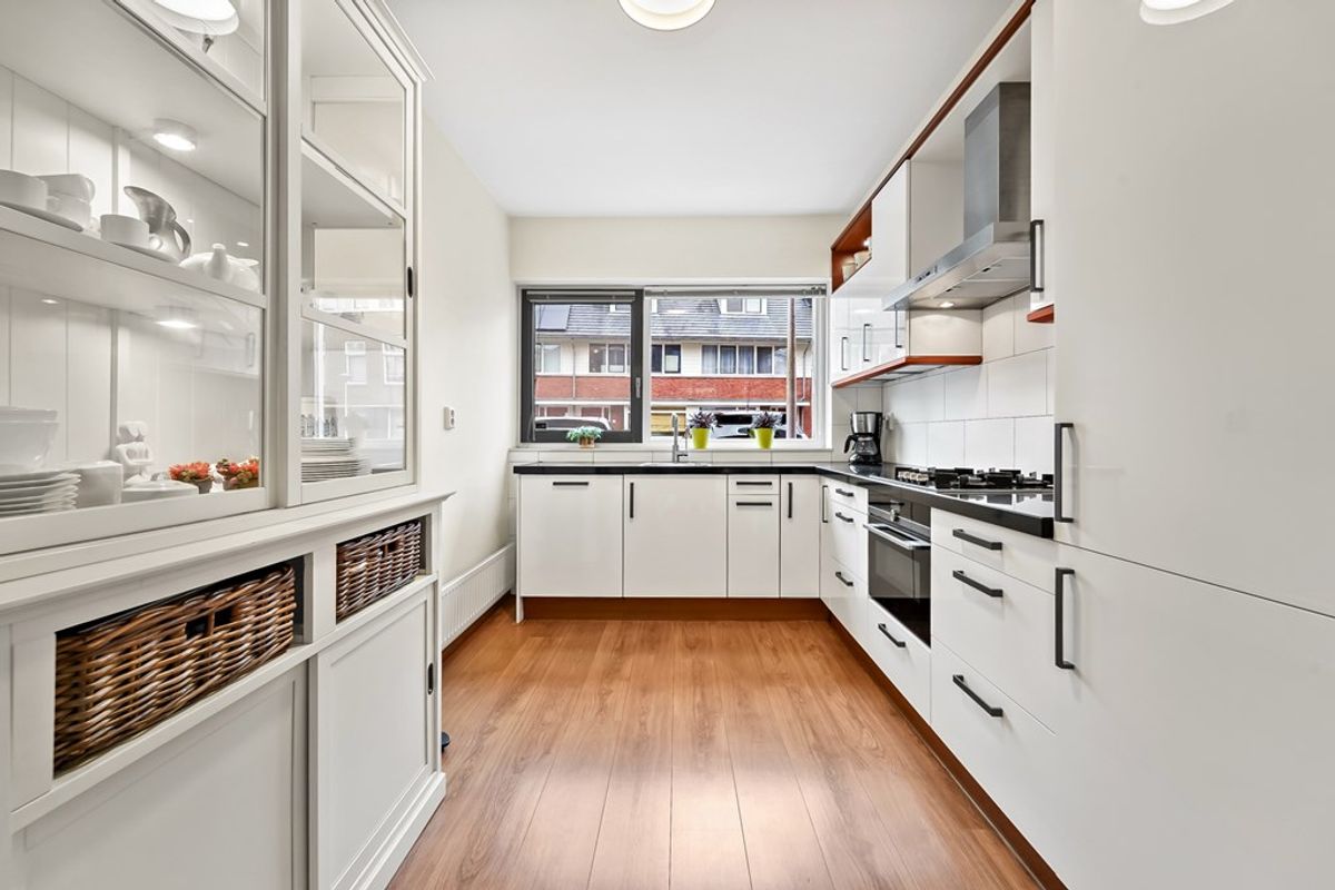 Entree, hal met meterkast, garderoberuime, toiletruimte met fonteintje en trap naar 1e verdieping. De woning beschikt over een lichte, tuingerichte woonkamer met dubbele deuren naar de zonnige achtertuin. De fraai aangelegde achtertuin biedt volop ruimte om te ontspannen, te spelen of gezellig buiten te eten, mede dankzij de zonnige zuidwest ligging. Achterin de tuin bevindt zich een praktische fietsenberging. De tuin is aan de achterzijde ontsloten via een brede poort. Aan de voorzijde van de woning bevindt zich de moderne keuken. Deze keuken is in 2025 gerenoveerd en is voorzien van diverse moderne inbouwapparatuur, waaronder een koel-vriescombinatie, 4 pits gaskookplaat, combi oven/magnetron, vaatwasser en afzuigkap. Een fijne ruimte met een moderne, frisse uitstraling, helemaal klaar voor vele jaren kookplezier. De gehele begane grond is voorzien van een laminaatvloer.