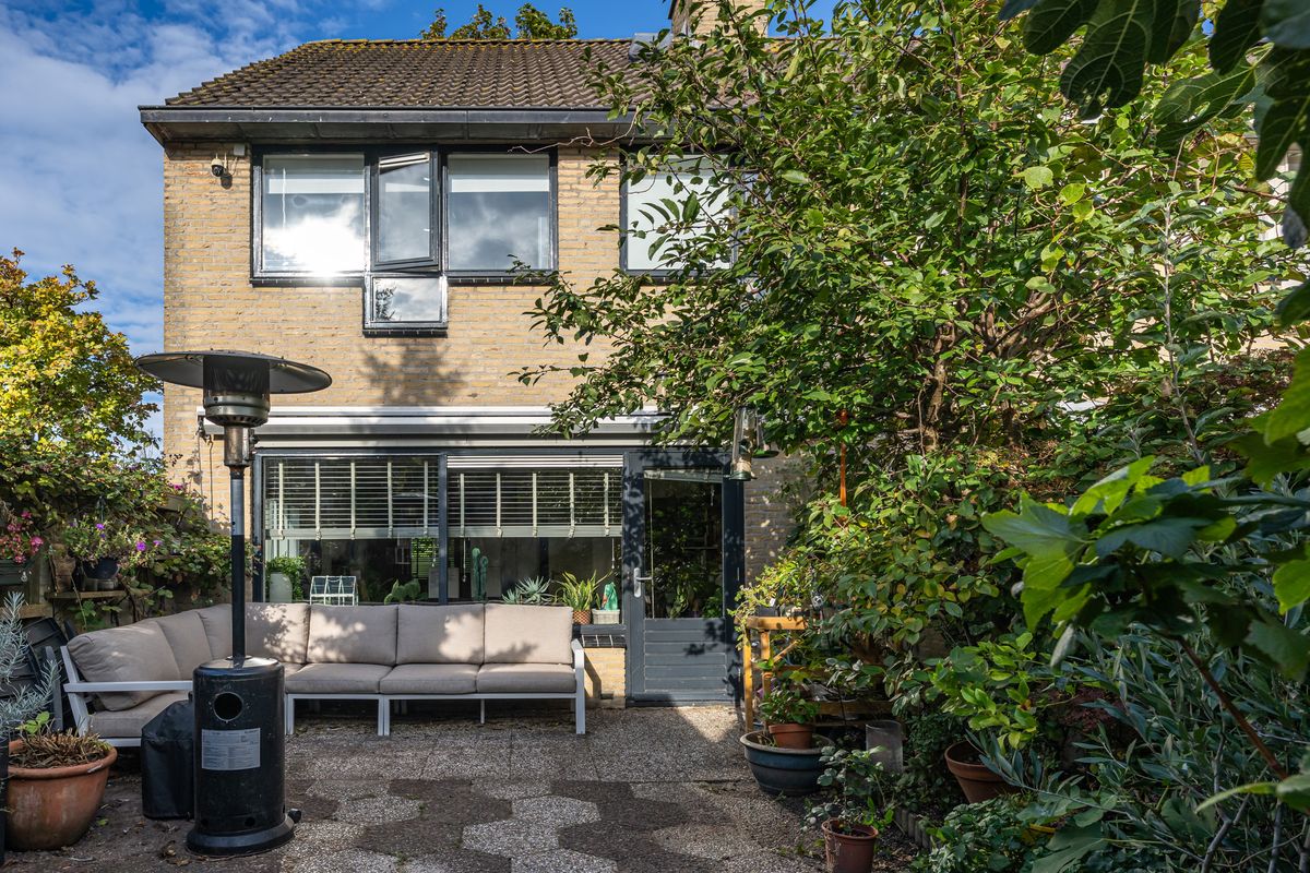Op het zuidoosten, deels bestraat, deels borders, zonnescherm handbediend, eigen achterom en buitenkraan.