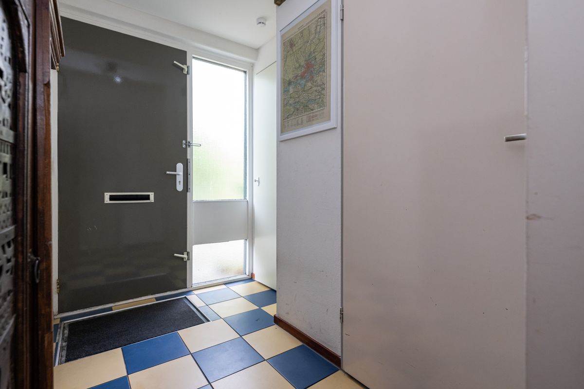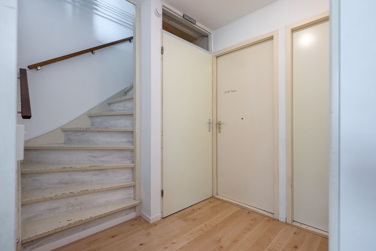 Laminaatvloer, trapkast, deur naar achtertuin, trapopgang en radiatoren.
