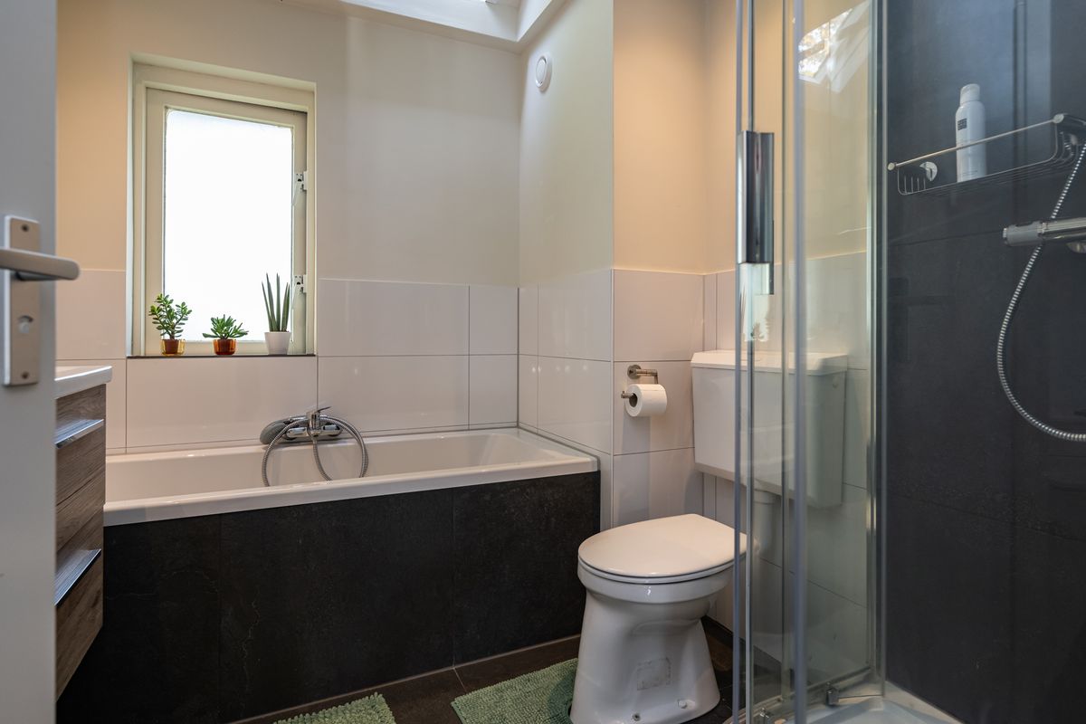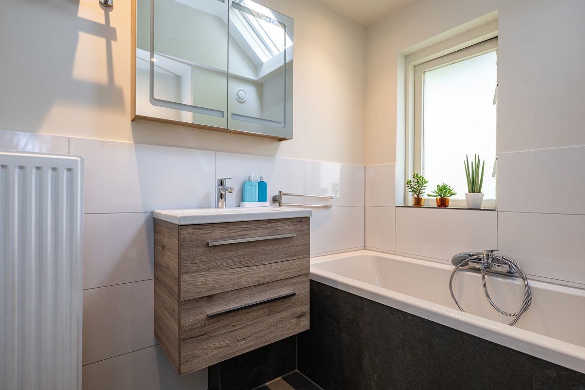 De badkamer is in 2022 volledig vernieuwd en heeft een moderne en frisse uitstraling. U vindt hier een comfortabele douche, een ligbad, een tweede toilet, een stijlvol wastafelmeubel en een praktische spiegelkast met verlichting. Alles is met zorg en oog voor detail afgewerkt, waardoor u hier elke dag met plezier gebruik van zult maken.