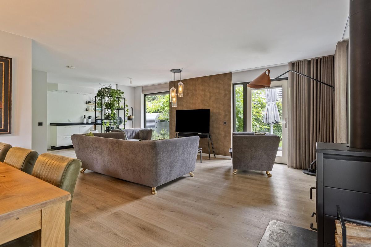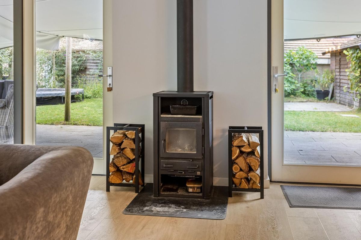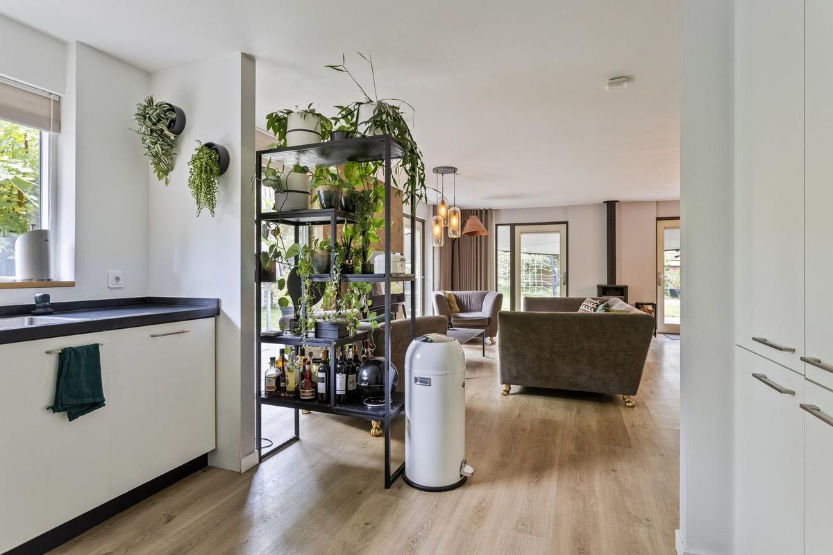 Indeling begane grond: Via de eigen oprit met laadpaal bereik je de woning. De voortuin en het ruime terras rondom de woning bieden direct een gevoel van privacy en rust. Bij binnenkomst in de hal proef je de sfeer van kwaliteit en verfijning: een strak afgewerkte ruimte met toegang tot de verschillende vertrekken, waaronder een veelzijdige kamer die momenteel in gebruik is als kantoor met vaste kast, maar ook uitstekend kan dienen als speelkamer of logeerkamer. Daarnaast is er, grenzend aan de keuken, een praktische bijkeuken met opstelplaats voor de cv-ketel. De riante woonkamer is een uitnodigende en sfeervolle leefruimte, gekenmerkt door de vele ramen en openslaande deuren die uitzicht bieden op de groene tuin De ruimte is met gevoel voor stijl ingericht en voorzien van vloerverwarming over de gehele begane grond. De houtkachel vormt het warme hart van de woonkamer, een plek waar je samenkomt met familie of vrienden voor lange avonden vol gezelligheid. De woonkamer loopt naadloos over in de eetkamer en de open keuken. De grote eettafel met acht comfortabele stoelen maakt het tot een ideale plek voor etentjes of ontspannen ontbijten met uitzicht op de natuur. De open keuken is een waar statement van luxe en functionaliteit. Uitgevoerd in tijdloos wit en zwart, en voorzien van alle moderne inbouwapparatuur die je mag verwachten. Zo beschikt de keuken over een keramische kookplaat, inbouwoven, spoelbak met kokend waterkraan, vaatwasser, koel-vrieskast, ruime werkbladen en meer dan voldoende kastruimte. Hier is koken niet alleen praktisch, maar ook een stijlvolle beleving. Vanuit de keuken kijk je uit op de fraai aangelegde tuin, waardoor elke maaltijd of kopje koffie een moment van rust en uitzicht biedt.