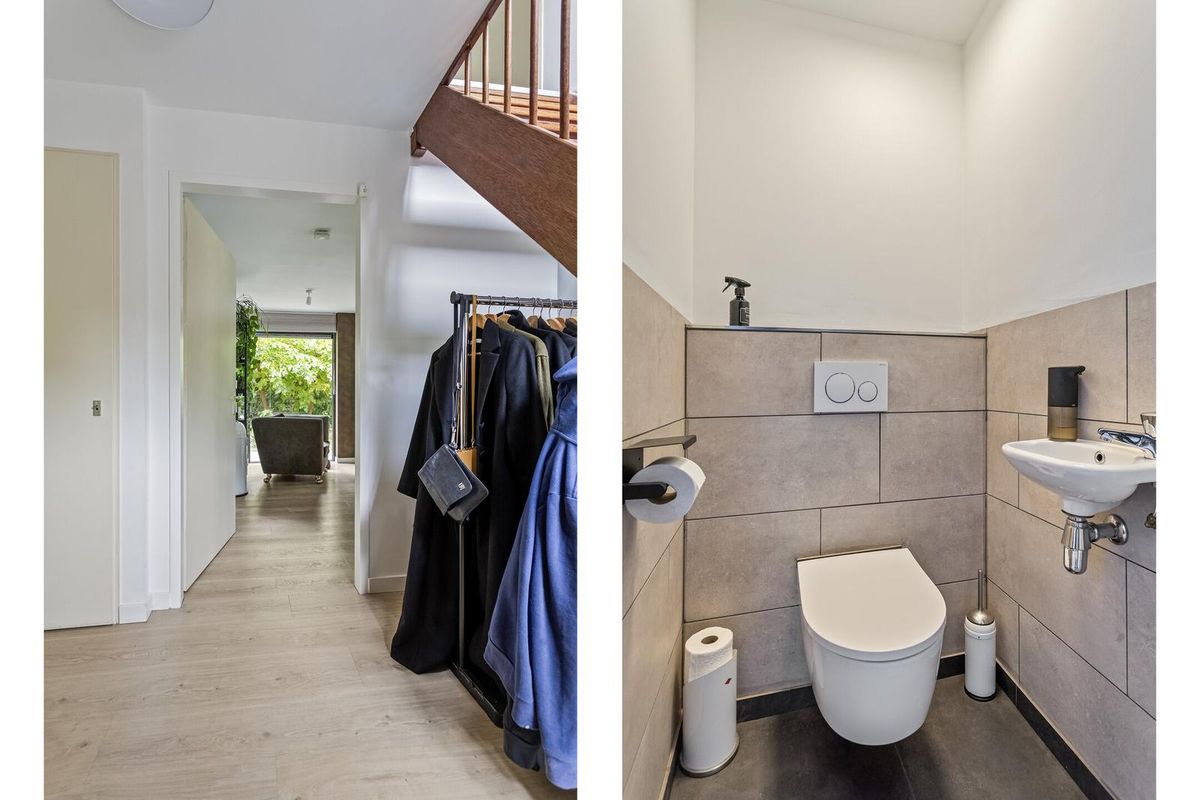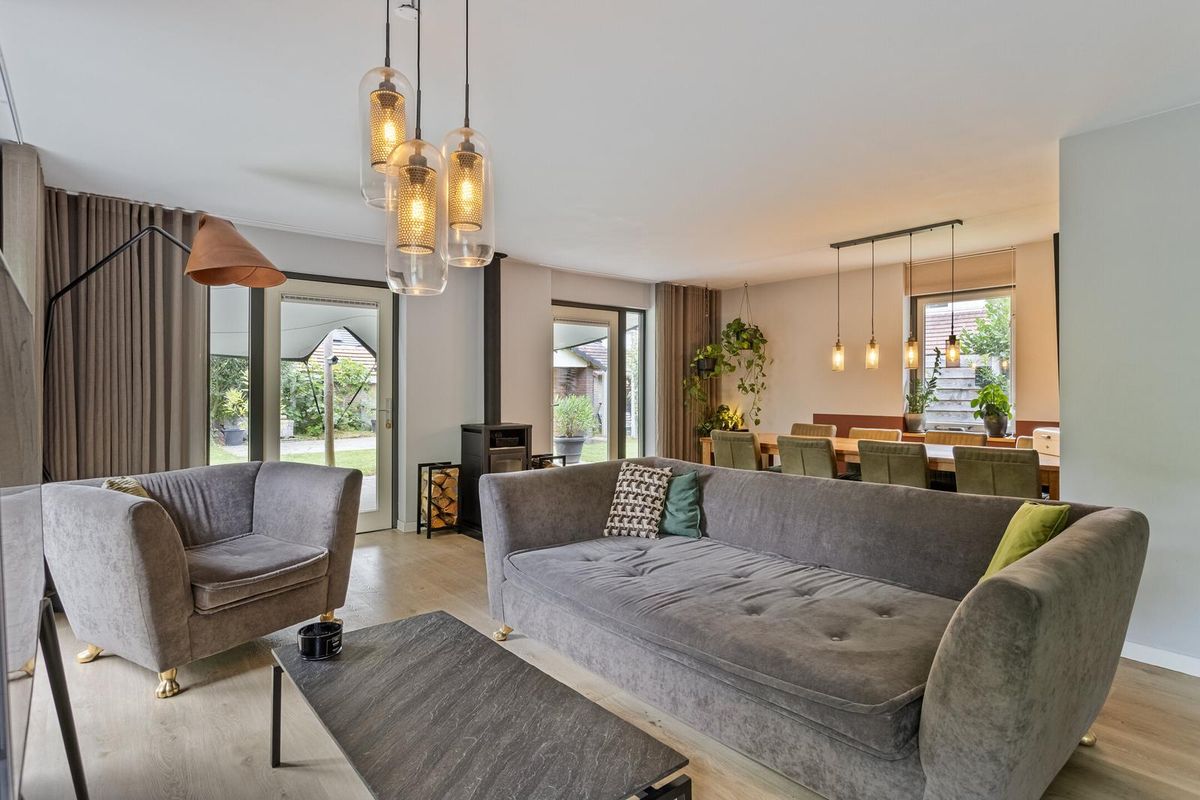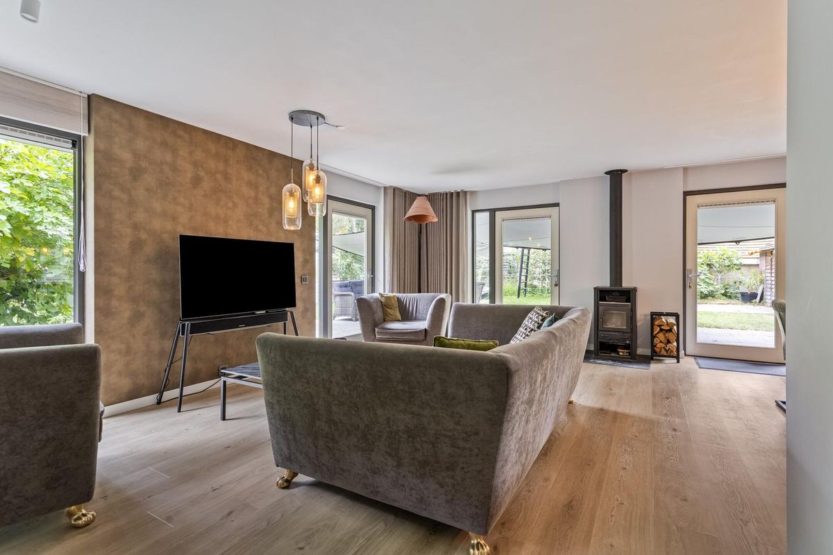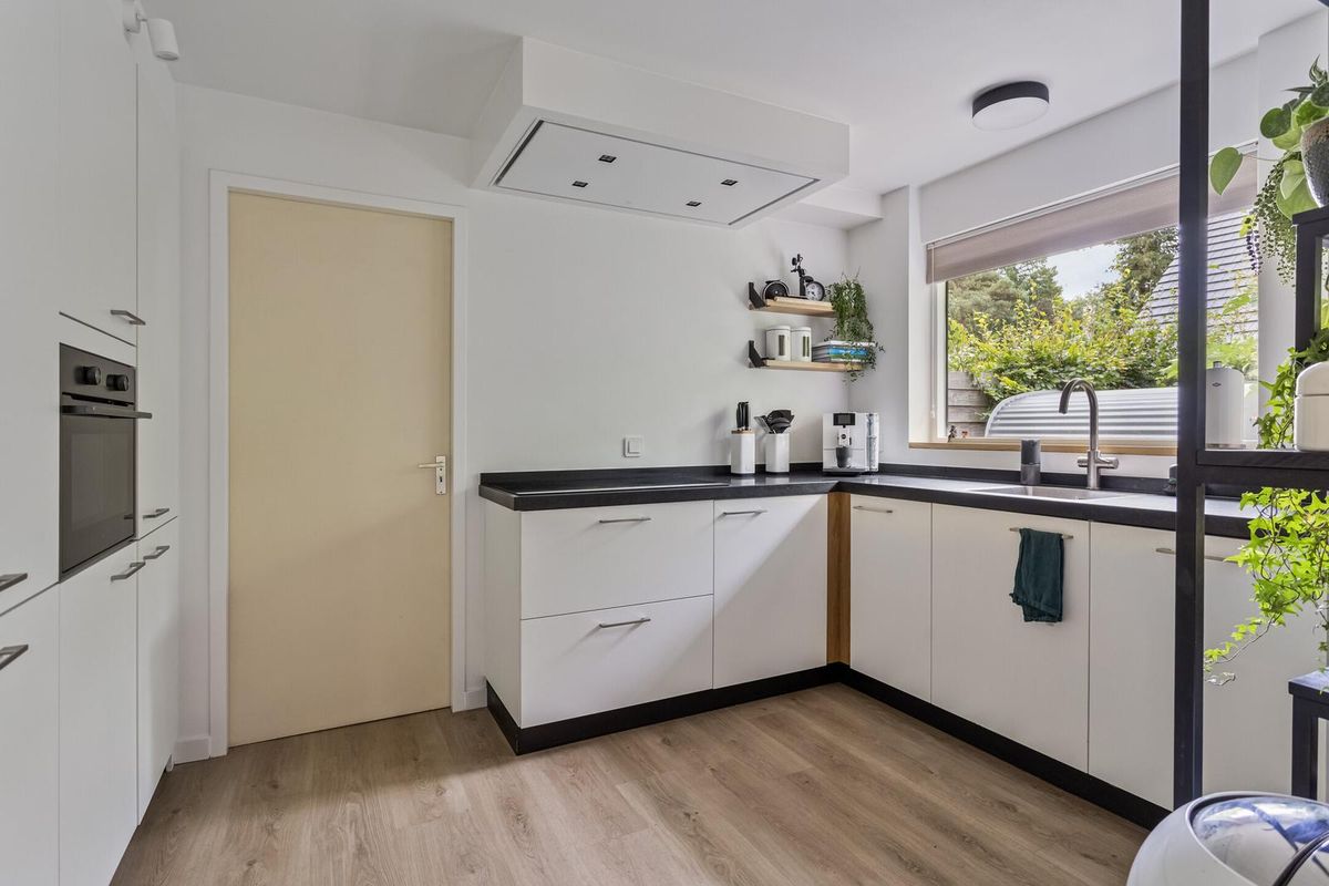 Indeling begane grond: Via de eigen oprit met laadpaal bereik je de woning. De voortuin en het ruime terras rondom de woning bieden direct een gevoel van privacy en rust. Bij binnenkomst in de hal proef je de sfeer van kwaliteit en verfijning: een strak afgewerkte ruimte met toegang tot de verschillende vertrekken, waaronder een veelzijdige kamer die momenteel in gebruik is als kantoor met vaste kast, maar ook uitstekend kan dienen als speelkamer of logeerkamer. Daarnaast is er, grenzend aan de keuken, een praktische bijkeuken met opstelplaats voor de cv-ketel. De riante woonkamer is een uitnodigende en sfeervolle leefruimte, gekenmerkt door de vele ramen en openslaande deuren die uitzicht bieden op de groene tuin De ruimte is met gevoel voor stijl ingericht en voorzien van vloerverwarming over de gehele begane grond. De houtkachel vormt het warme hart van de woonkamer, een plek waar je samenkomt met familie of vrienden voor lange avonden vol gezelligheid. De woonkamer loopt naadloos over in de eetkamer en de open keuken. De grote eettafel met acht comfortabele stoelen maakt het tot een ideale plek voor etentjes of ontspannen ontbijten met uitzicht op de natuur. De open keuken is een waar statement van luxe en functionaliteit. Uitgevoerd in tijdloos wit en zwart, en voorzien van alle moderne inbouwapparatuur die je mag verwachten. Zo beschikt de keuken over een keramische kookplaat, inbouwoven, spoelbak met kokend waterkraan, vaatwasser, koel-vrieskast, ruime werkbladen en meer dan voldoende kastruimte. Hier is koken niet alleen praktisch, maar ook een stijlvolle beleving. Vanuit de keuken kijk je uit op de fraai aangelegde tuin, waardoor elke maaltijd of kopje koffie een moment van rust en uitzicht biedt.