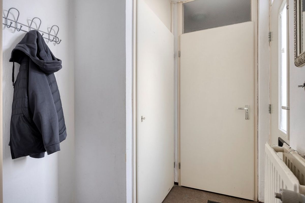 Via de entree aan de voorzijde komt u binnen in de hal met toegang tot het toilet en een vaste kast. De trap naar de eerste verdieping bevindt zich in een separate gang vanuit de woonkamer. Hier bevindt zich ook een ruime trapkast.