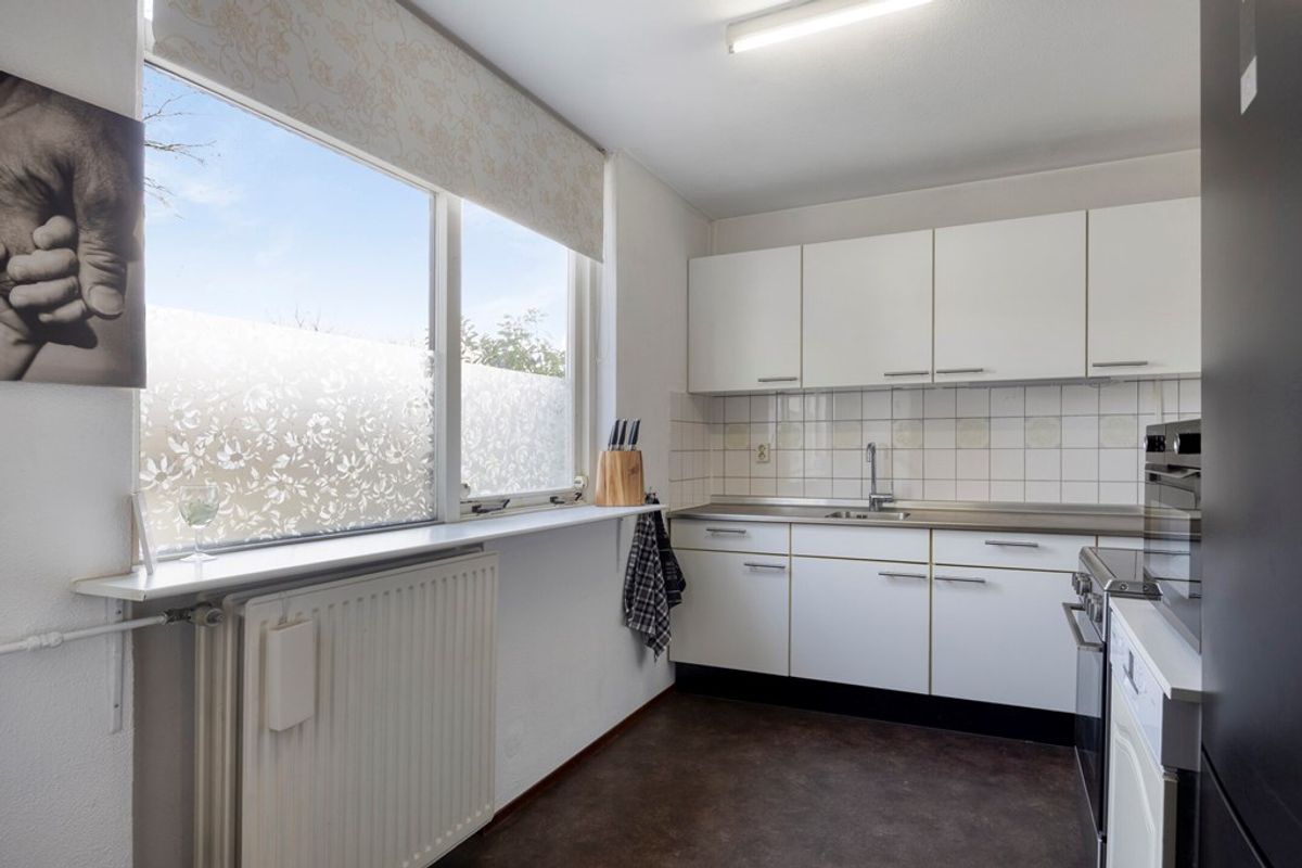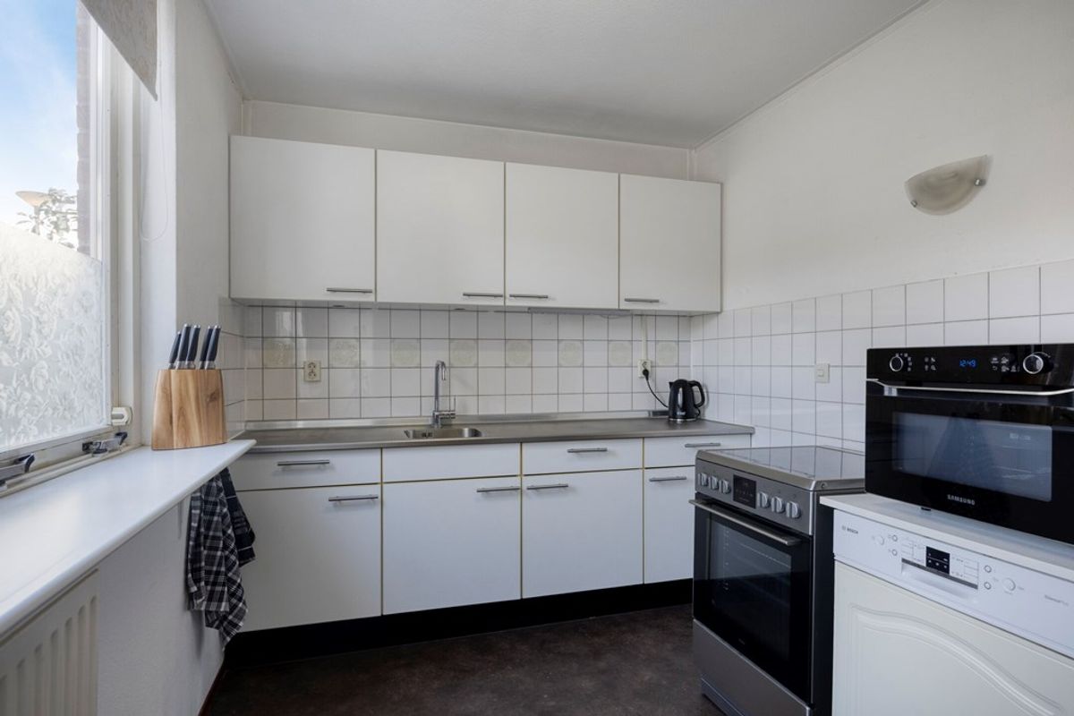 De keuken bevindt zich aan de voorzijde van de woning en is eenvoudig uitgevoerd. De keuken staat in open verbinding met de woonkamer en is voorzien van: