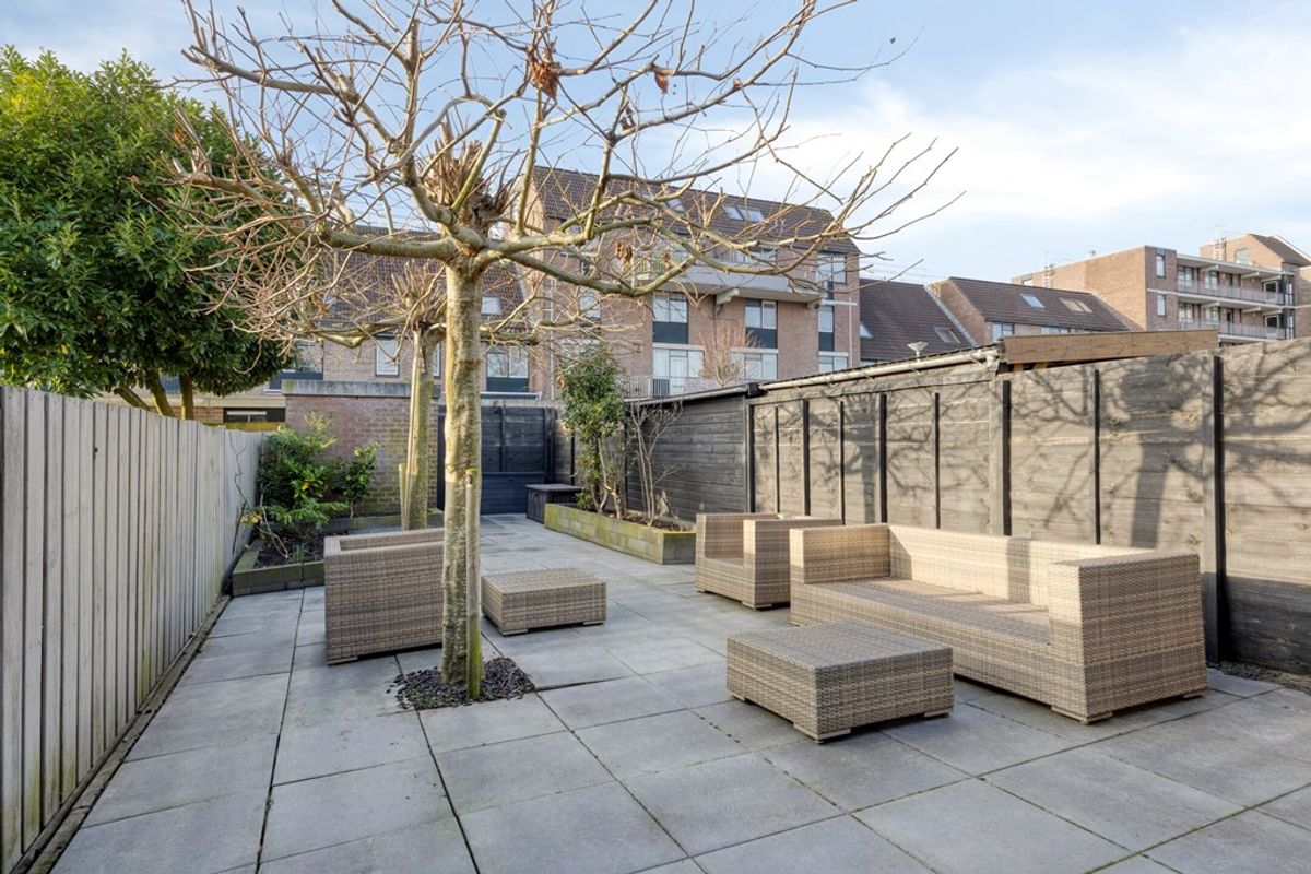 De woning beschikt over een zeer ruime en onderhouden achtertuin met berging en zowel in de voor- als achtertuin is een buitenkraan aanwezig. Aan de voorzijde bevindt zich een hofje met speelplaats, wat bijdraagt aan een rustige en veilige woonomgeving. Er is geen doorgaand verkeer, maar stilstaan voor de woning is mogelijk ten behoeve van laden en lossen. De straat is zeer autoluw en daarmee bijzonder kindvriendelijk.