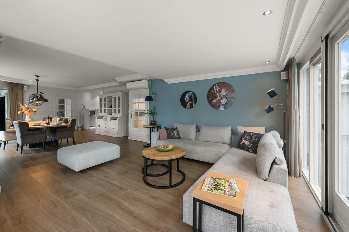 De lichte woonkamer vormt het hart van de woning en is bijzonder ruim van opzet. Door de ronde vorm en brede raampartijen geniet u hier de hele dag van zonlicht en een vrij zicht op de tuin. Dit is een plek waar u heerlijk kunt ontspannen en gasten kunt ontvangen.