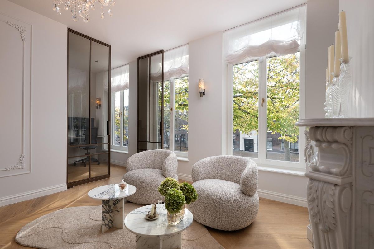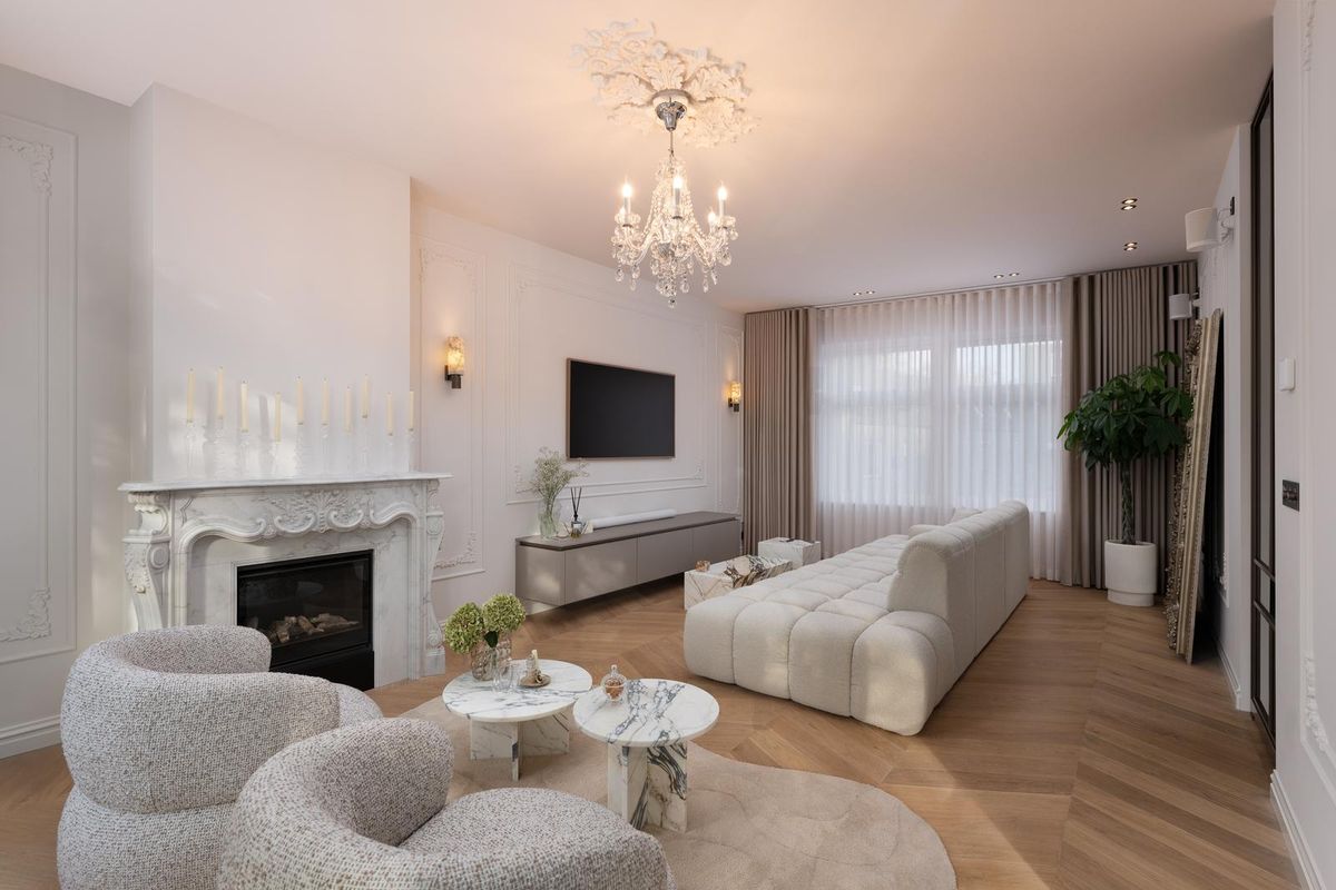 De eerste verdieping ademt rust en elegantie. De woonkamer strekt zich uit over de volle breedte, met hoge ramen die licht diep naar binnen brengen. De gashaard vormt het hart, omlijst door een marmeren schouw en verfijnde wandpanelen.