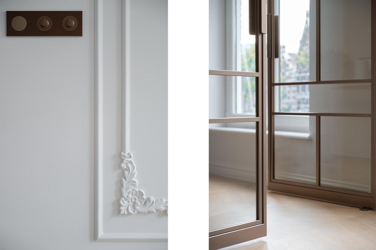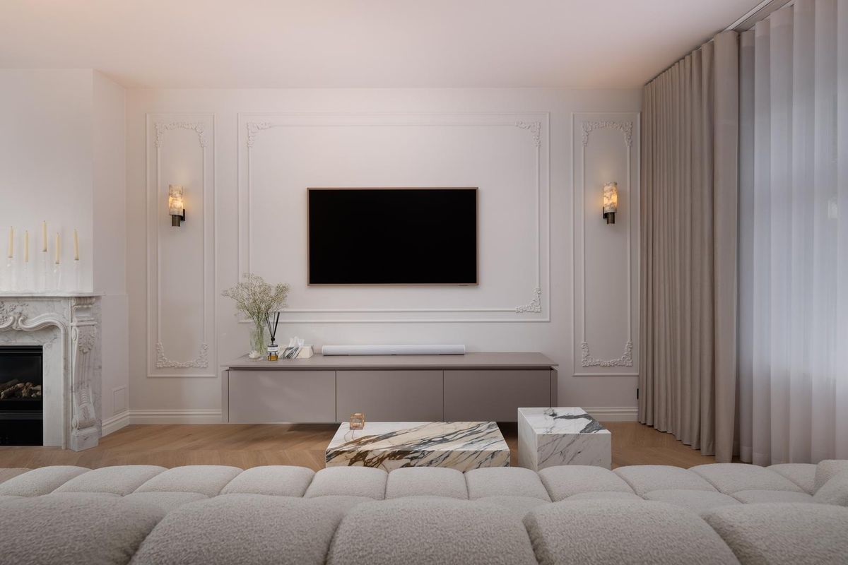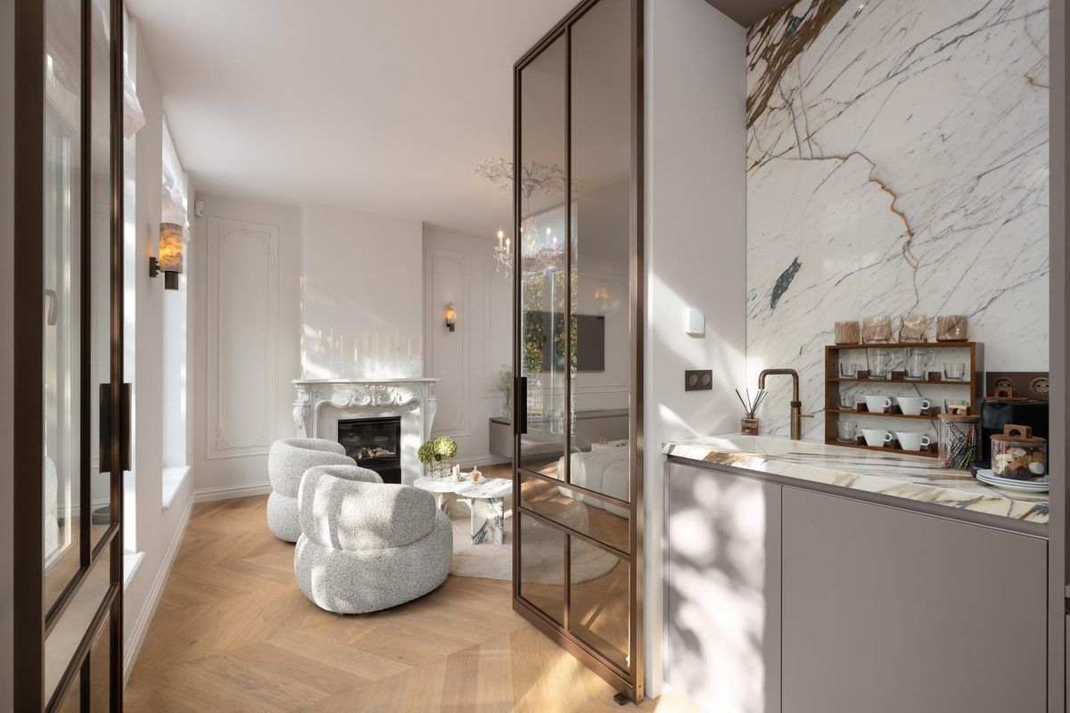 Eenmaal binnen ervaar je hoogte, licht en harmonie. De hoge plafonds, sierlijke lambriseringen en subtiele verlichting langs de trap creëren grandeur en rust tegelijk. Elk detail klopt: van marmeren accenten tot taatsdeuren, van maatwerk kasten tot de consistentie van schakelaars en lijnen.