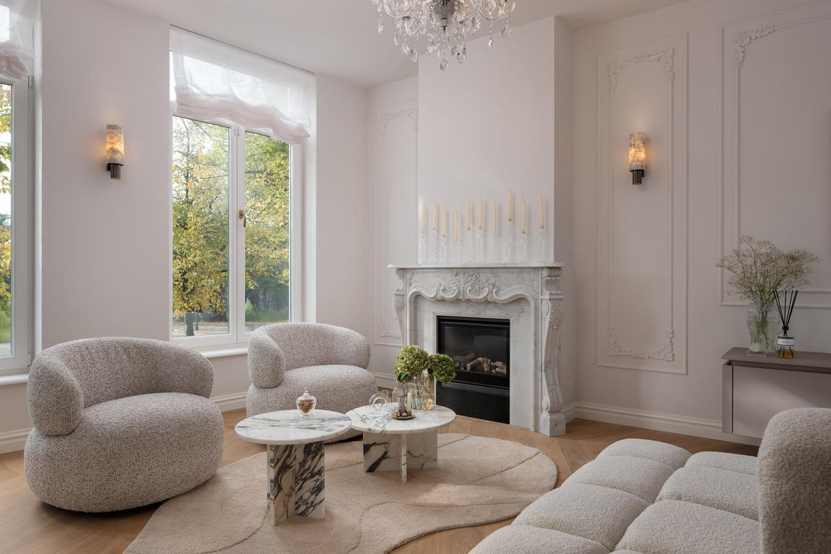 The first floor exudes tranquility and sophistication. The living room spans the full width, with tall windows drawing in light. The gas fireplace forms the heart of the space, framed by a marble mantel and refined wall panels.