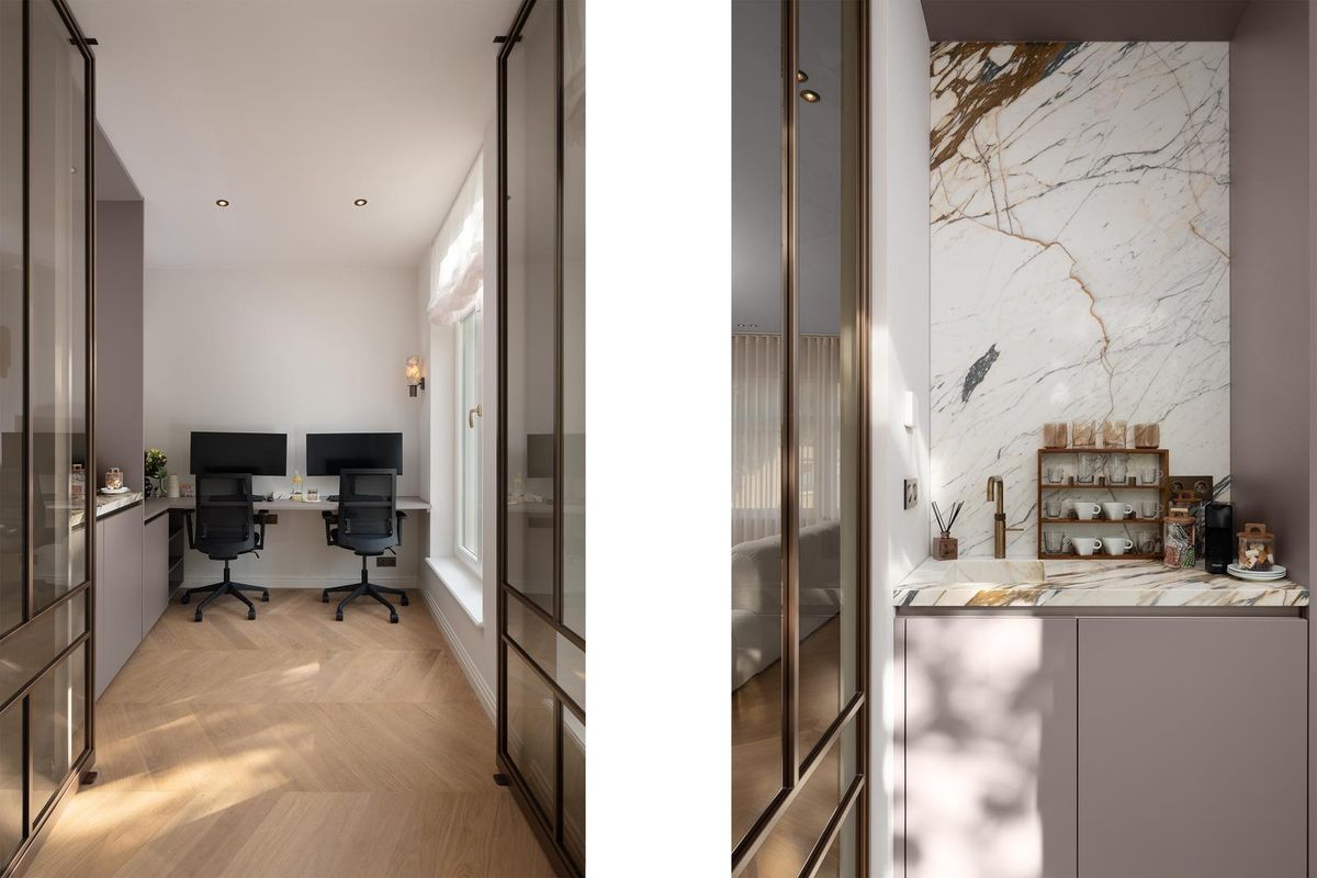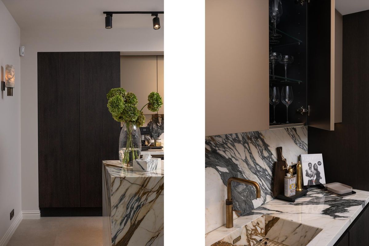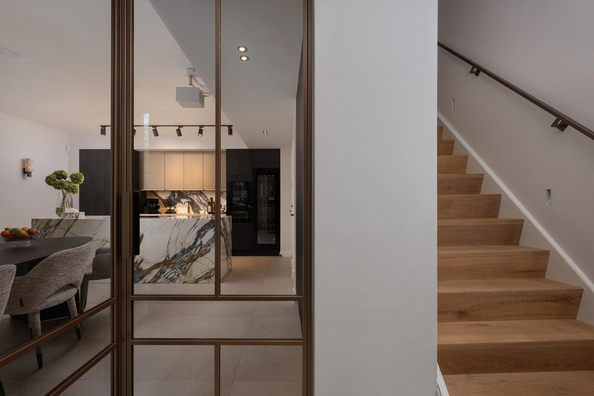 Step inside and you’re greeted by height, light, and harmony. High ceilings, decorative wall panelling, and subtle lighting along the staircase create both grandeur and calm. Every detail is right — from marble accents to pivot doors, from bespoke cabinetry to the consistency of finishes and lines.