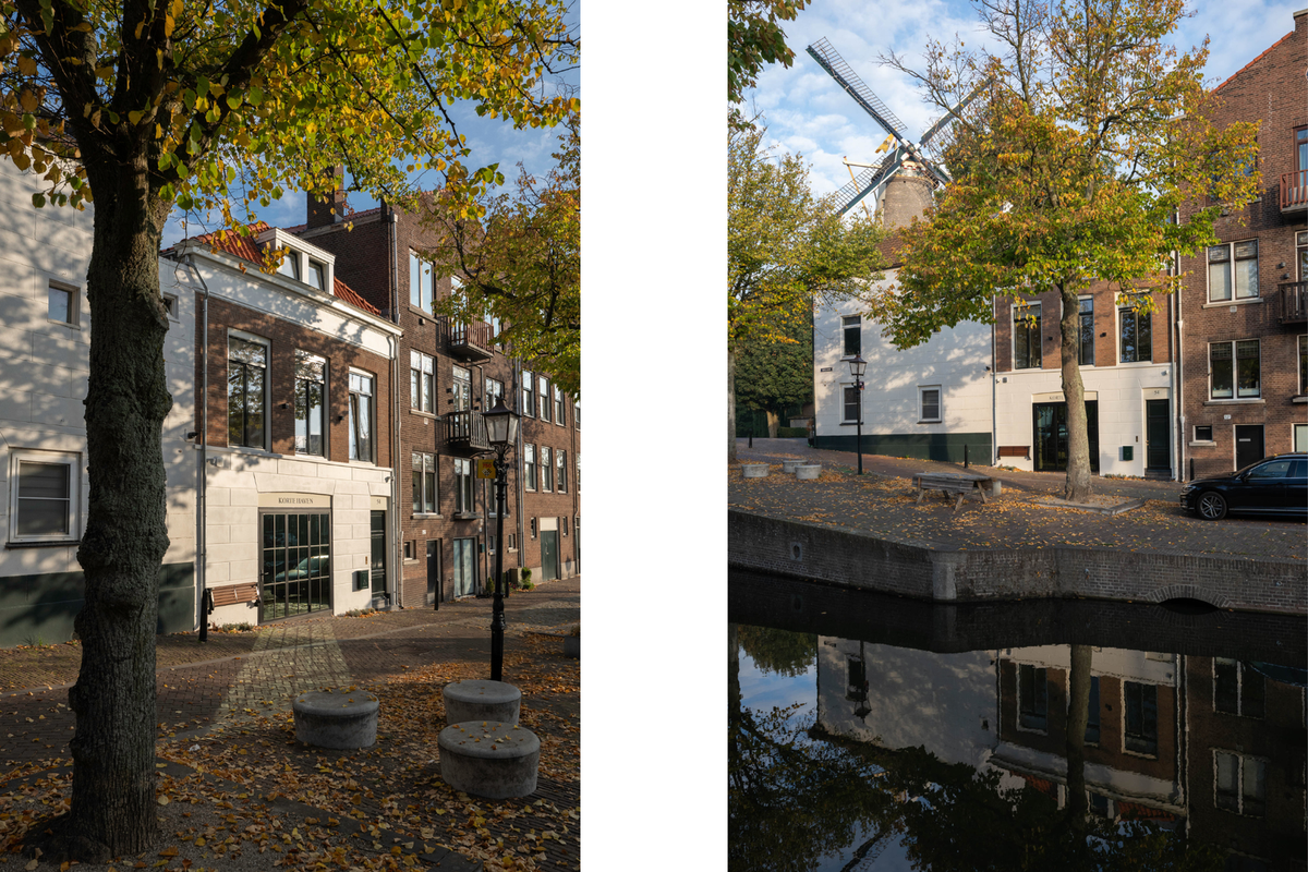 Korte Haven 54 sits in the Brandersbuurt, one of Schiedam’s most characterful neighborhoods. The city is steeped in jenever (Dutch gin) history — once the world capital of jenever production — with monumental warehouses, distilleries, and the tallest windmills on earth as living witnesses.