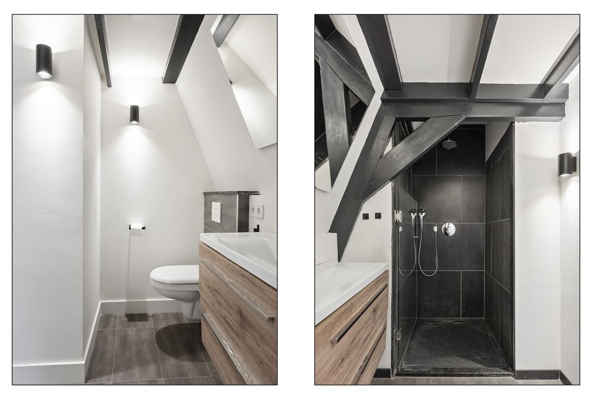 2e verdieping: open ruimte, slaapkamer aan de voorzijde, badkamer met dubbele wastafel, toilet en inloopdouche, aansluiting voor wasmachine en CV-installatie. Ouderslaapkamer aan de achterzijde. De verdieping is voorzien van meerdere dakramen.