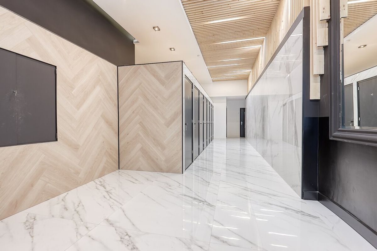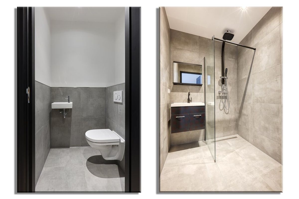 Hal met directe doorloop naar de woonkamer met open luxe keuken voorzien van stenen aanrechtblad en alle nodige inbouwapparatuur zoals koelkast, vriezer, oven, magnetron, vaatwasser, inductiekookplaat en afzuigkap. Toilet met wastafeltje.