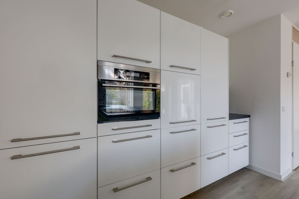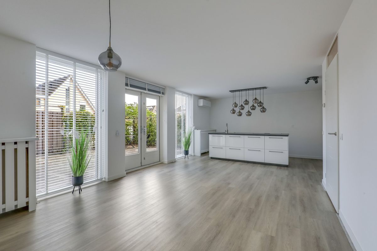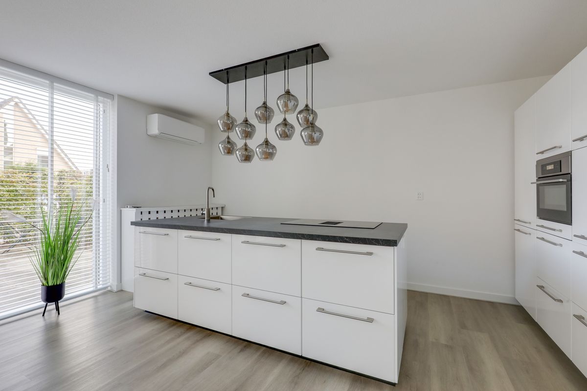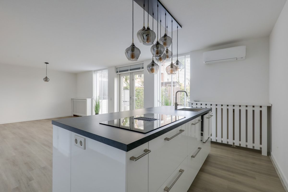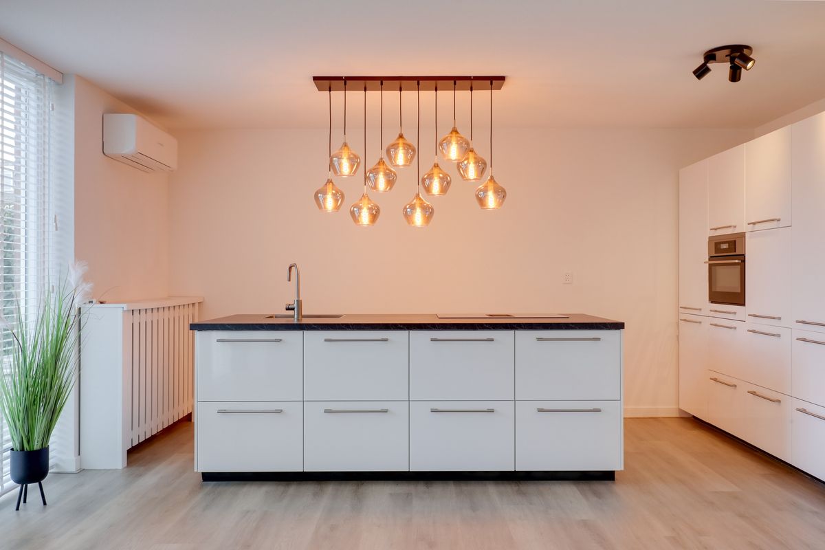 De laatste deur in de hal brengt ons naar de lichte woonkamer met open keuken en openslaande deuren naar de achtertuin. De keuken is voorzien van een prachtig kookeiland met 4 pits inductiekookplaat (en geïntegreerde afzuiging), vaatwasser en spoelbak met aan beide zijden veel lades. Aan de muurzijde de kastenwand van de keuken met daarin de koelkast, vriezer en combi- magnetron/stoomoven en een leuk hoekje in te richten als bijvoorbeeld een koffiebar. Tevens is daar nog een kastje vrijgelaten voor een extra oven of magnetron. Vanuit de keuken heb je fijn contact met het woongedeelte, voor het kookeiland is er voldoende plaats voor een eettafel waar je gezellig met vrienden kunt dineren of borrelen. Bij mooi weer zet je lekker de twee openslaande deuren open en bij erg warm weer gebruik je de airconditioning .