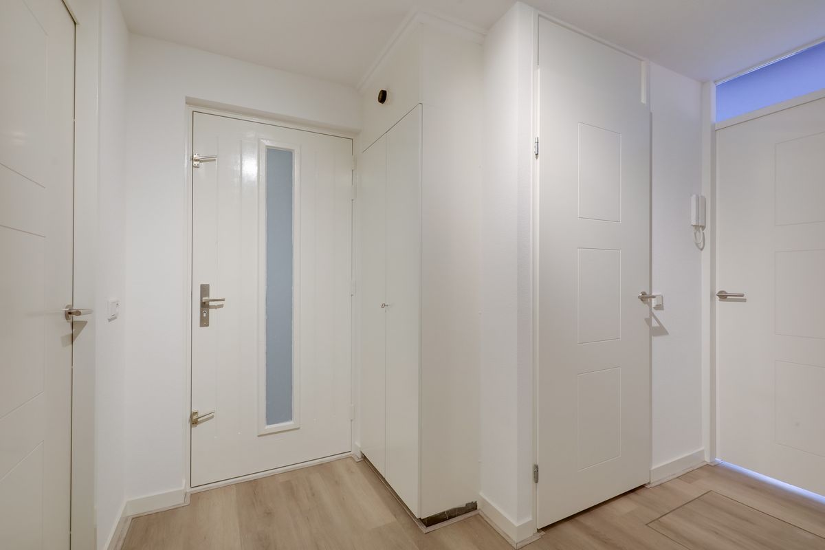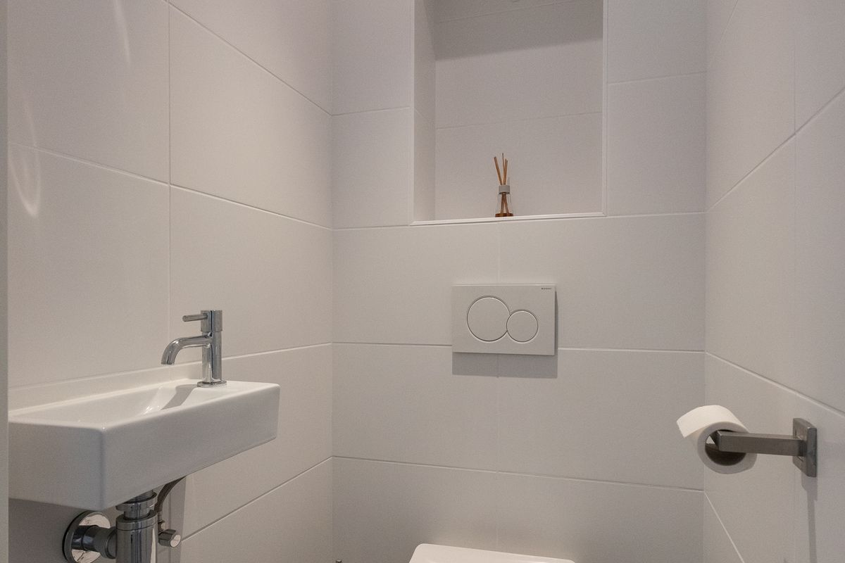 Via de centrale voordeur bereiken je het appartement en staan we in de hal die toegang geeft tot de volgende vertrekken: de meterkast, moderne toiletruimte met zwevend toilet en fonteintje (2022), kast met mechanische ventilatie-unit (2020), cv ketel (Remeha Avanta 2012) en het plekje voor de wasmachine en droger. De strakke badkamer heeft een inloopdouche, wastafelmeubel, dimbaar en verwarmde spiegel (2022) en een designradiator.