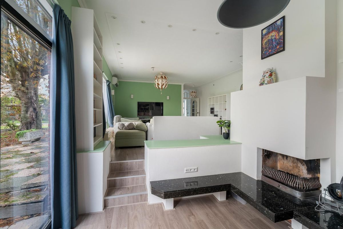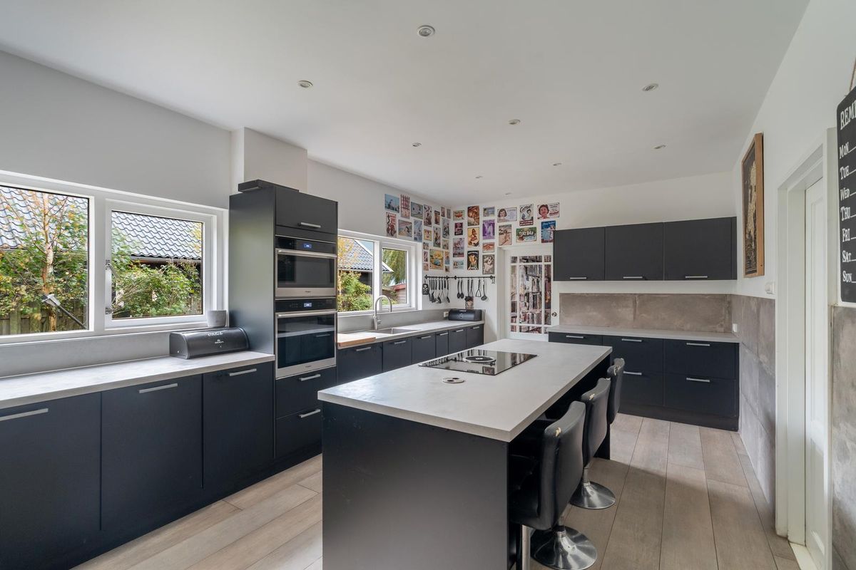 Toegang naar de ruime woonkamer met aangrenzend een lager geleden zitkamer met openhaard en schuifpui naar buiten. De grote woonkeuken is bereikbaar via zowel de woon- als de eetkamer, is voorzien van vloerverwarming en is in 2019 geplaatst. Hier vind je een groot kookeiland met bar, volop kast- en werkruimte, met de volgende inbouwapparatuur: BORA inductiekookplaat met afzuiging, vaatwasmachine, koelkast, vriezer, oven, combi-oven magnetron en kokend water kraan. Vanuit de keuken is de inpandige garage toegankelijk. Deze is ruim van formaat en beschikt over een elektrische deur, wateraansluiting en elektra. Er is tevens een zijdeur naar buiten.