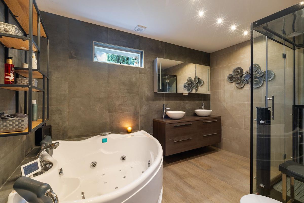 Voortuin met oprit voor 3 auto's, laadpaal en toegang tot de woning. Ruime hal met moderne toiletruimte (2019) met hangend toilet en fonteintje. Uitgebreide meterkast met krachtstroom. De eerste slaapkamer ligt op de begane grond met deur naar de zijtuin en aangrenzend een uitgebreide badkamer (2019). Deze is voorzien van een whirlpool ligbad, dubbele wastafel met meubel, toilet, douche met infraroodsauna en elektrische vloerverwarming.