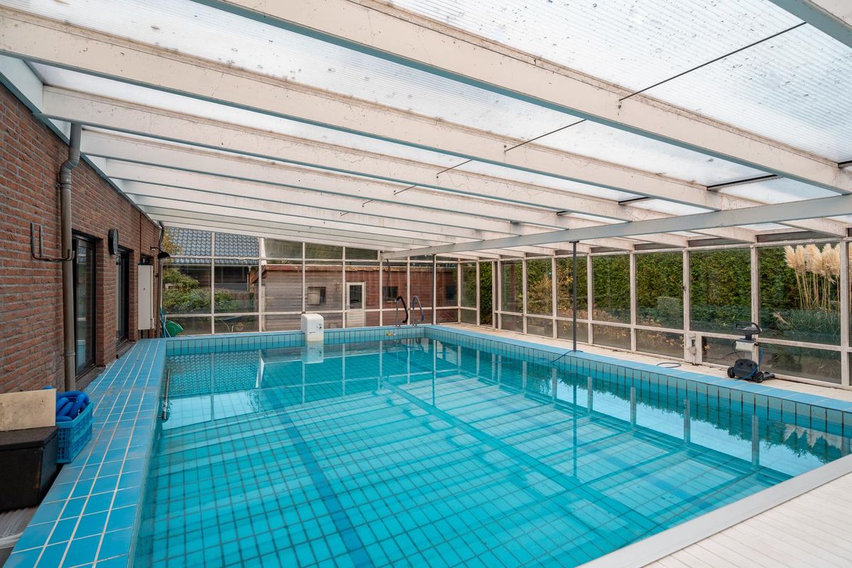 De eetkamer is gelegen aan de achterzijde van de woning, is ook voorzien van vloerverwarming, geeft toegang naar de aanbouw met zwembad en er is een lager gelegen zithoek met schuifpui en open haard. Vanuit deze kamer is er toegang naar de kelder (ca. 2 m. hoog) met veel bergruimte, een wijnkamer en de technische installatie voor het zwembad, de cv-ketel (Remeha 2021) en de aansluiting voor de wasmachine en droger. De uitbouw aan de achterzijde van de woning is in de jaren '80 geplaatst met een volwaardig zwembad en daarnaast ruimte voor een gym.