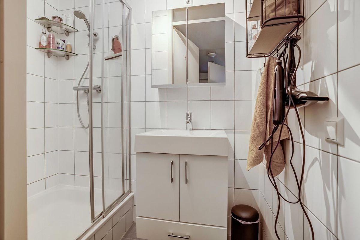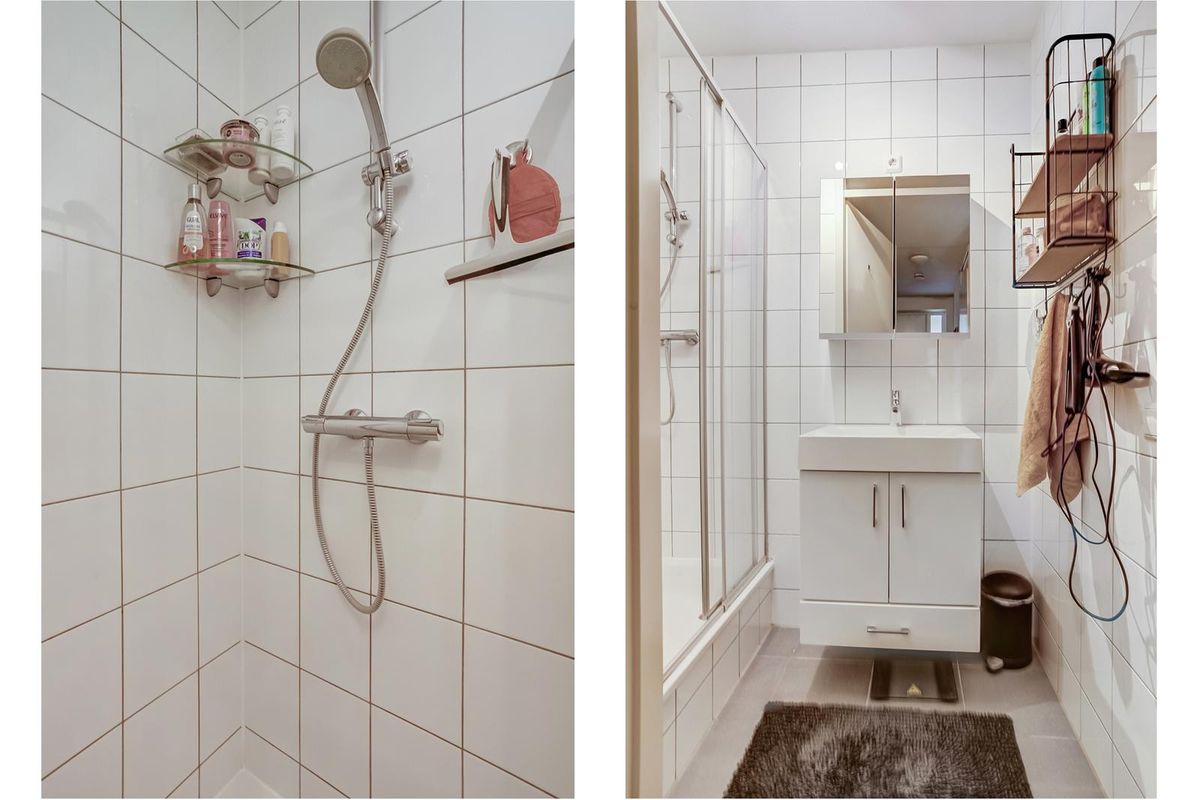 De badkamer is geheel betegeld met witte tegels waardoor deze een frisse uitstraling heeft die tijdloos is. Verder vind je hier een douche en wastafelmeubel.
