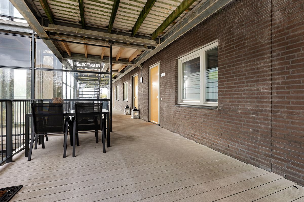 De galerij van het gebouw heeft een ruime overloop, waardoor er plek is voor een klein zithoekje.
