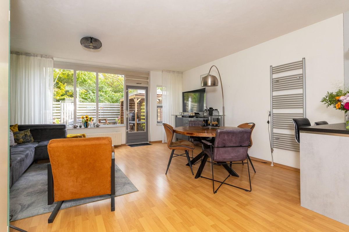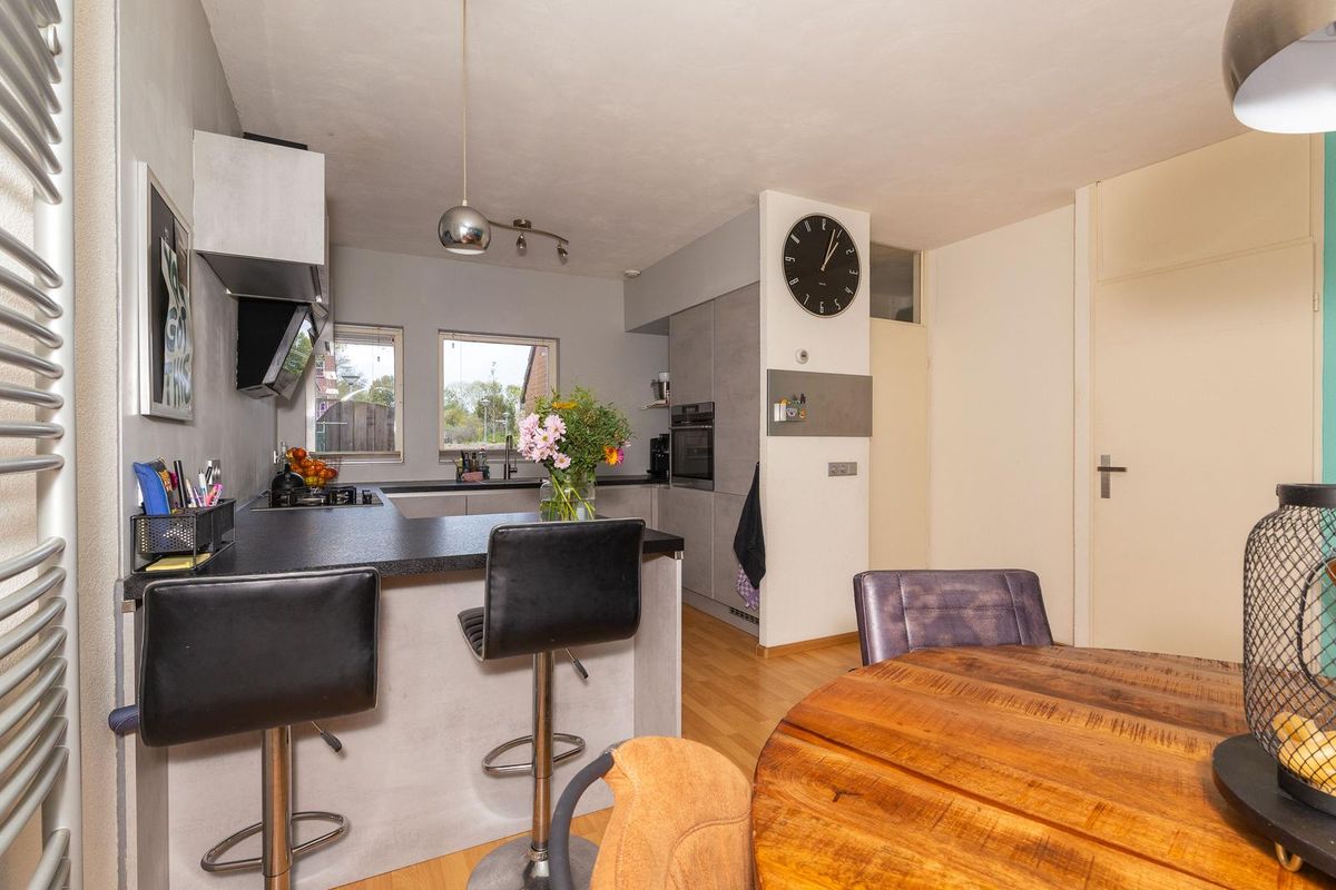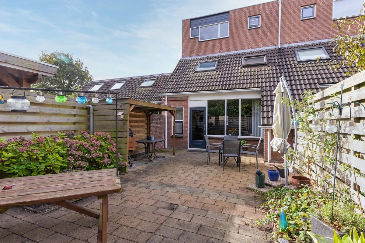 Indeling Begane grond: entree/hal met meterkast, toiletruimte en de vaste trap naar de eerste verdieping, ruime, tuingerichte woonkamer met grote raampartijen en de aangebouwde stenen berging. De open keuken in U-vormige opstelling bevindt zich aan de voorzijde van de woningen is voorzien van diverse inbouw apparatuur. Via de achterdeur of de poort aan de achterkant van de woning is de grote en onderhoudsvriendelijke tuin te bereiken.