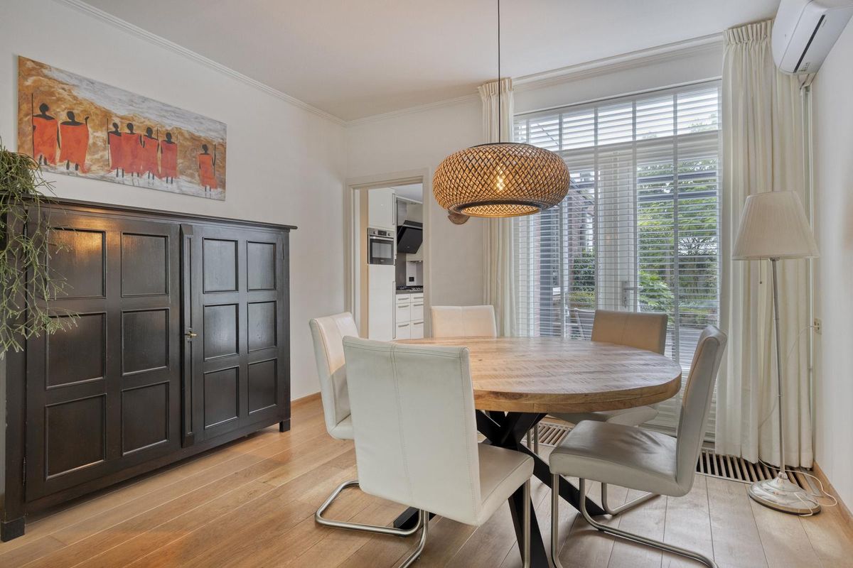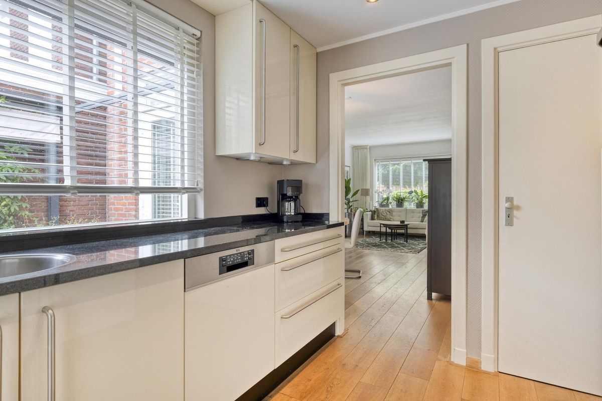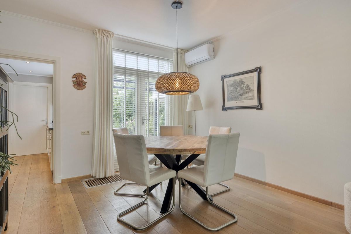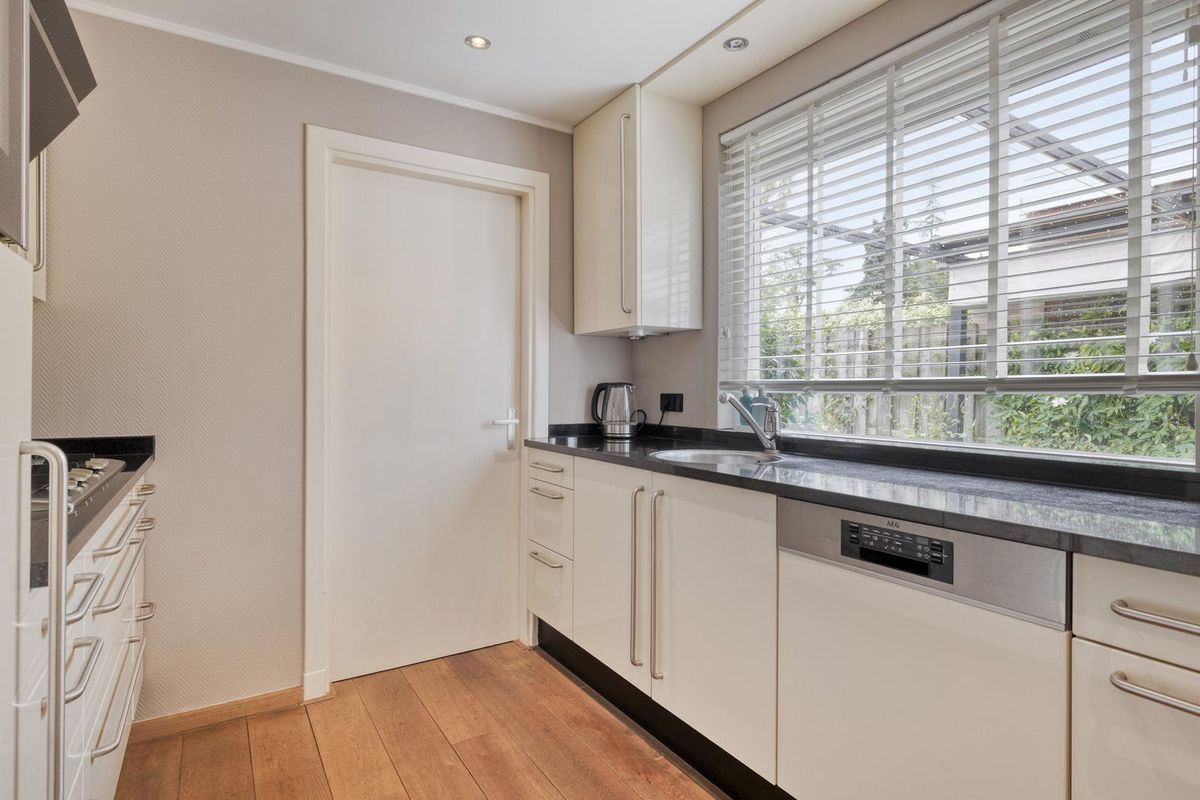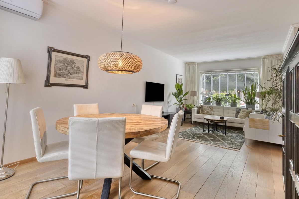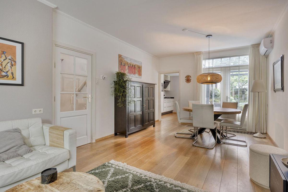 Indeling: Entree via de hal. De doorzonwoonkamer is voorzien van een eiken houten vloer, dubbele deur naar de tuin en airconditioning. De halfopen keuken is uitgerust met een spoelbak, 5-pits gaskookplaat, vaatwasser combioven en afzuigkap. Aangrenzend aan de keuken bevindt zich een praktische bijkeuken met aansluiting voor wasmachine en droger en opstelplaats voor de cv-ketel. tevens bevindt zich hier ook het toilet. Vanuit de bijkeuken heb je toegang tot de tuin.