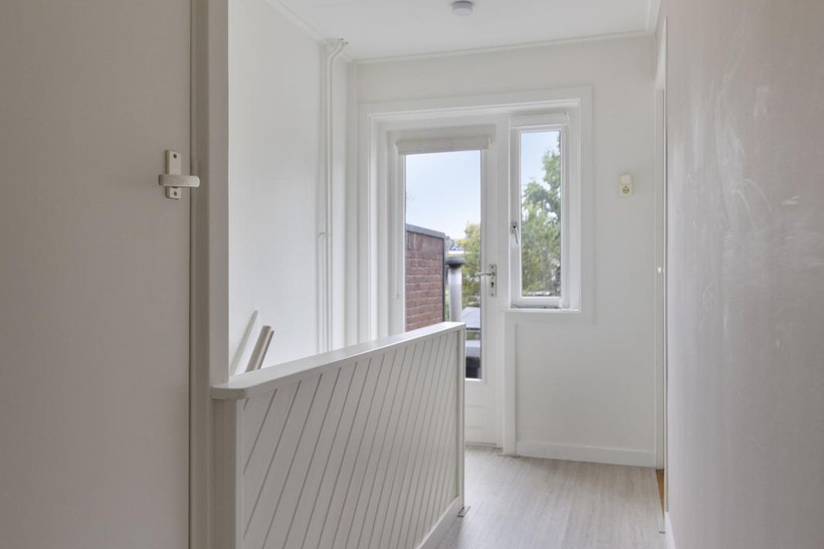 1e verdieping: Overloop met toegang tot twee slaapkamers, één aan de voorzijde en één aan de achterzijde van de woning. De zeer moderne badkamer(2021) beschikt over een ruime inloopdouche wastafel en toilet,
