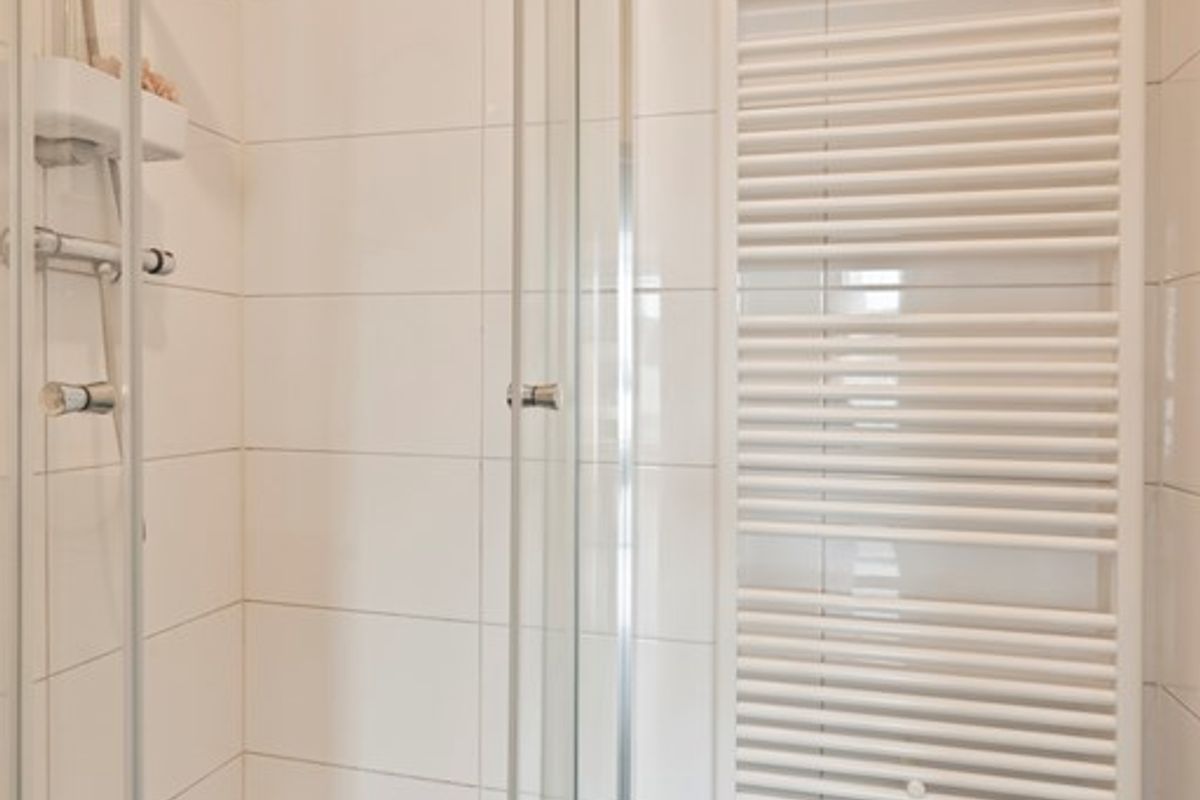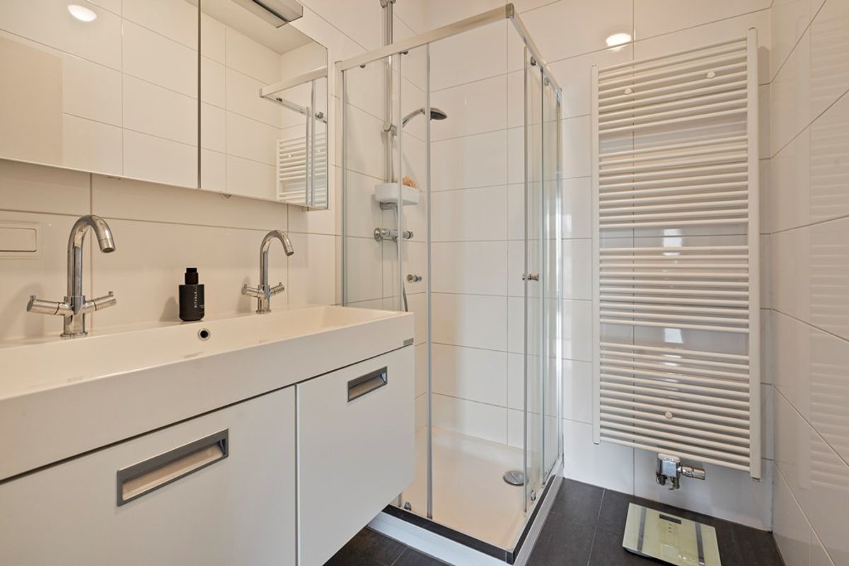 - Nieuwe betegelde badkamer met douche (glasdeur), badmeubel met dubbele wastafel en designradiator.
