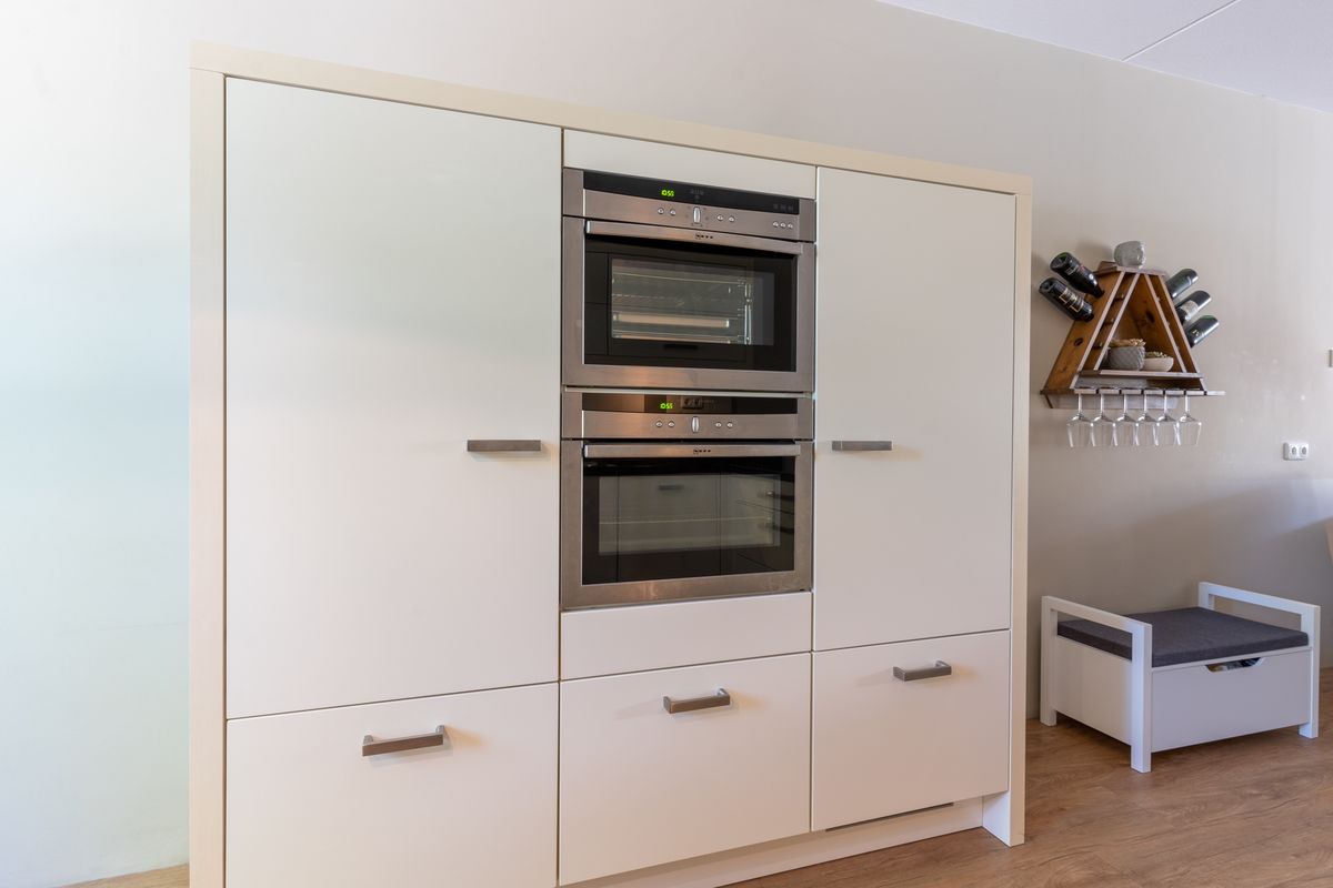 hal met toilet, grote uitgebouwde woonkamer met open keuken in U-vorm met eetbar aan de voorzijde. De gehele begane grond is voorzien van een mooie PVC-vloer met vloerverwarming.