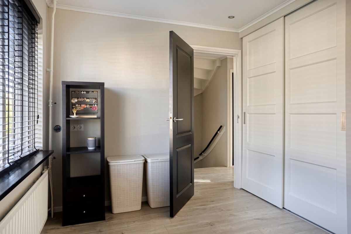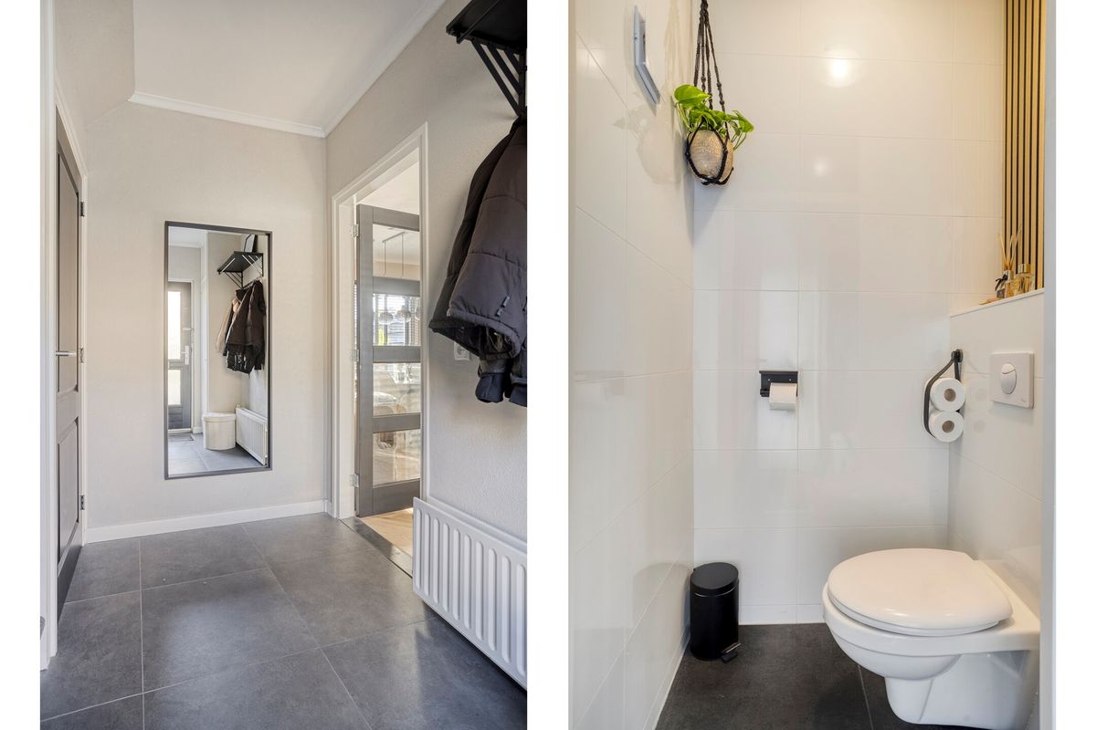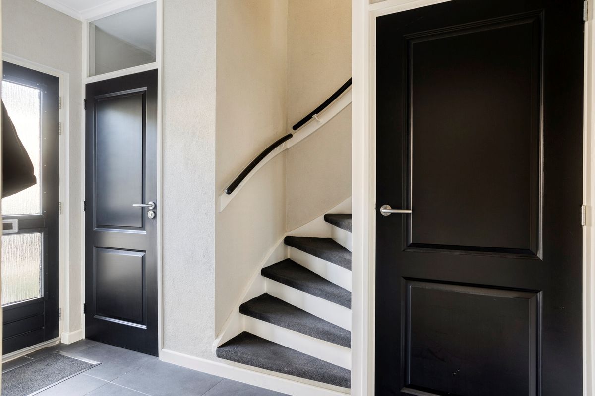 Je stapt binnen in een nette hal met plavuizen vloer, waar je meteen de praktische indeling ziet: meterkast (4 groepen + aardlek), toilet, trapopgang én een handige trapkast. Vanuit hier loop je door naar de woonkamer, en die voelt meteen goed.