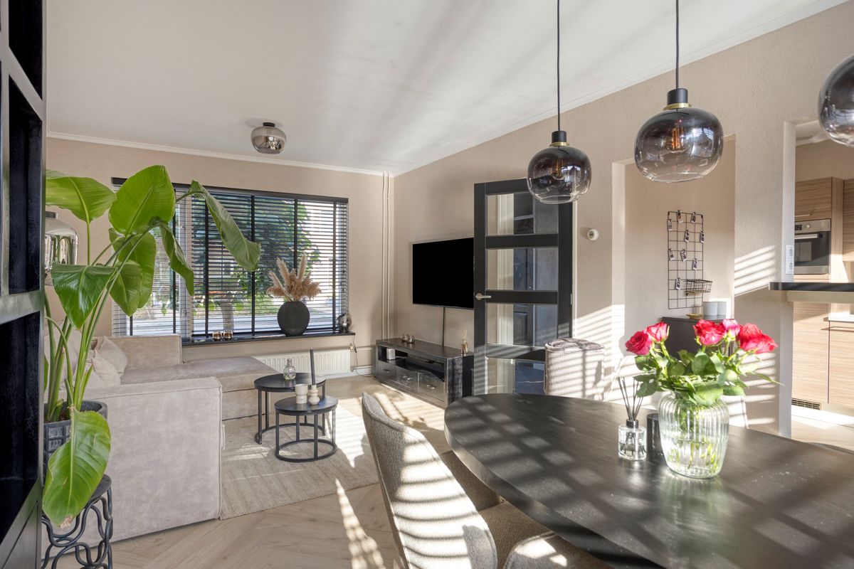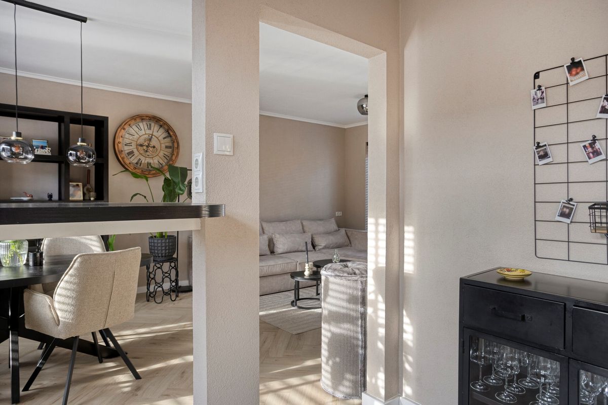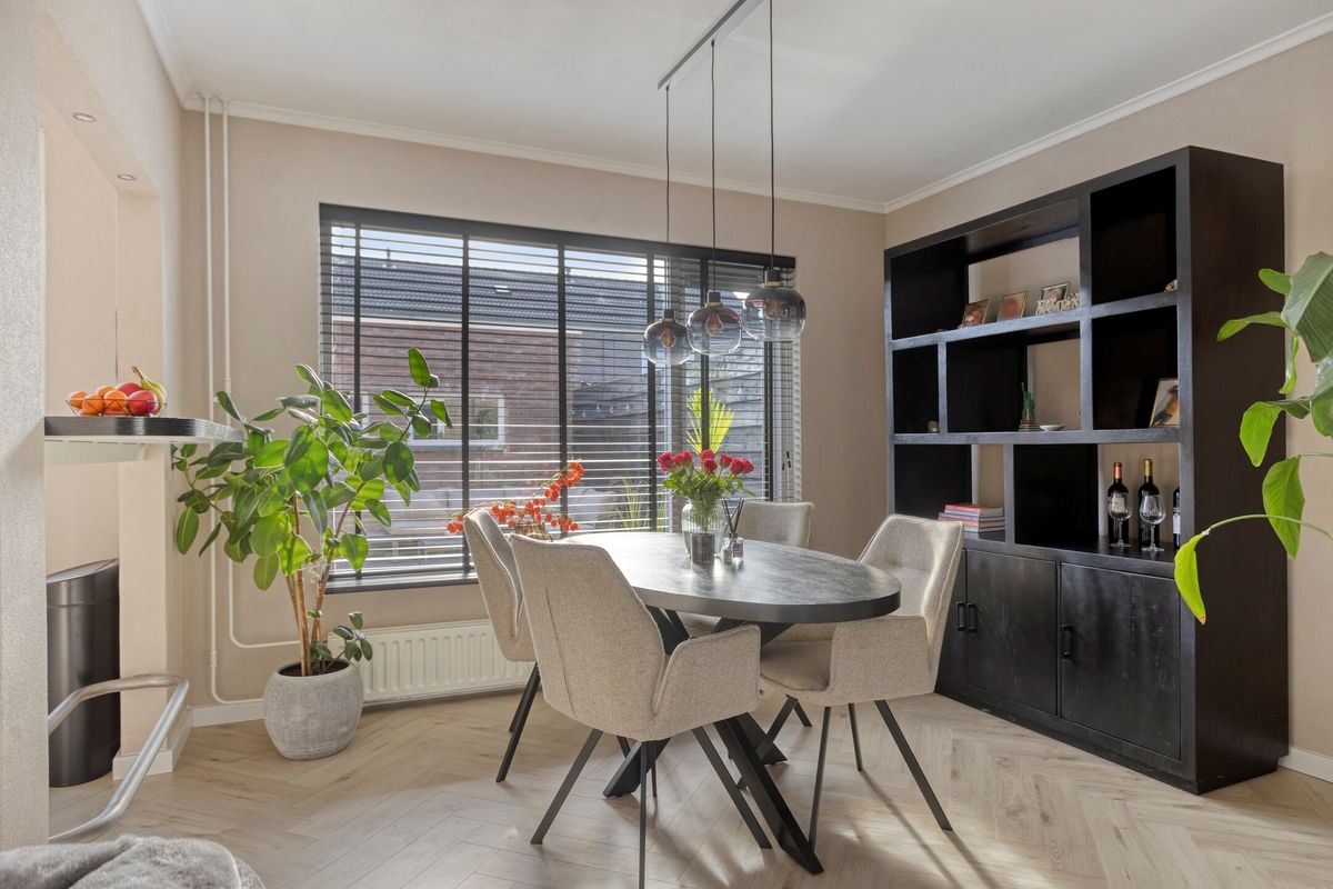 De visgraat laminaat-vloer (2024) zorgt voor een moderne en warme uitstraling, terwijl het zachte kleurgebruik en de grote houten kozijnen het licht mooi binnenlaten. Aan de voorzijde is een knusse zithoek ingericht met uitzicht op de voortuin. De eethoek aan de achterzijde staat in directe verbinding met de keuken en tuin, ideaal voor etentjes en gezinsmomenten.
