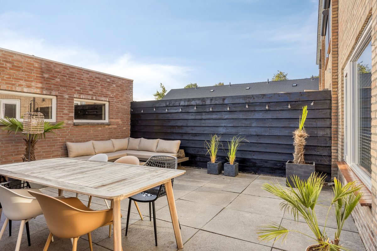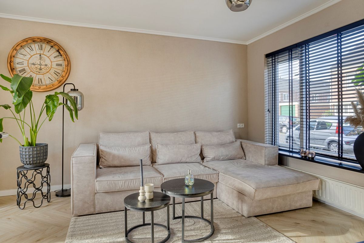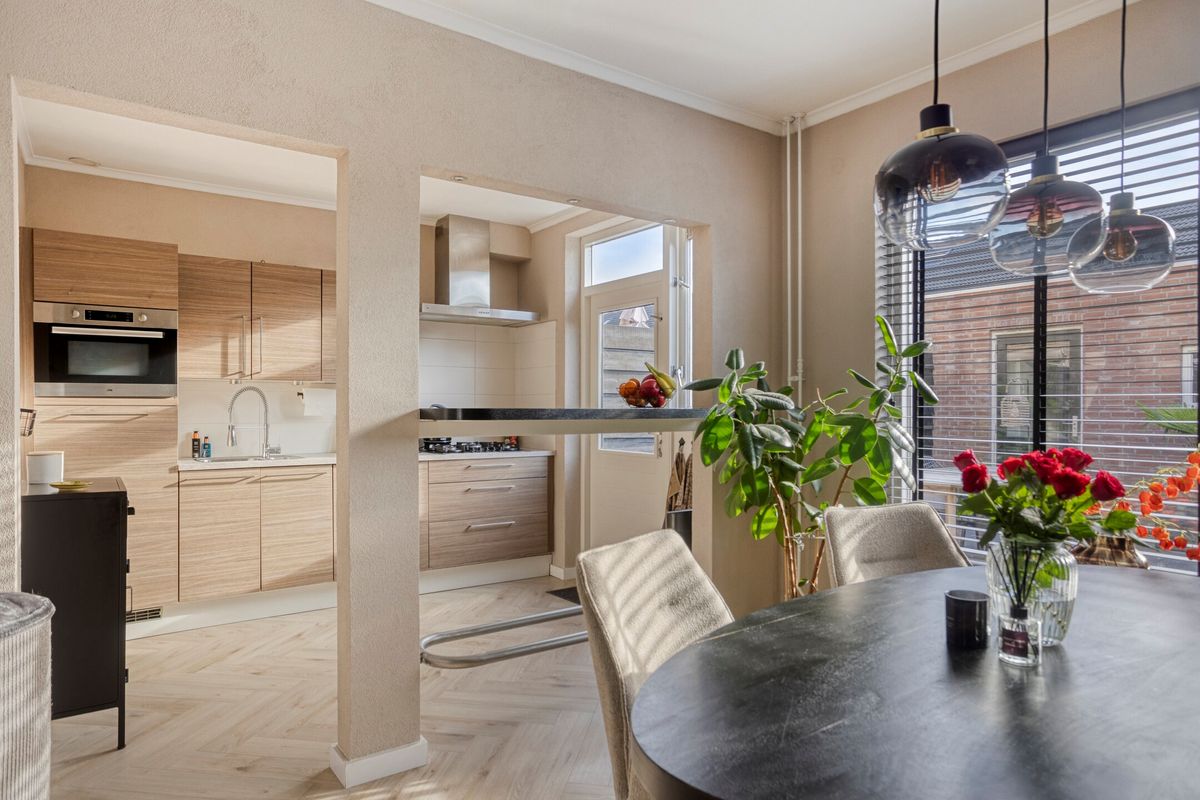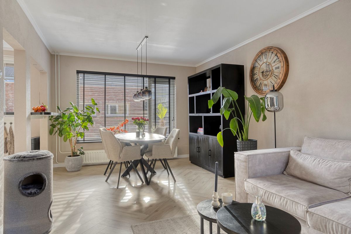 De visgraat laminaat-vloer (2024) zorgt voor een moderne en warme uitstraling, terwijl het zachte kleurgebruik en de grote houten kozijnen het licht mooi binnenlaten. Aan de voorzijde is een knusse zithoek ingericht met uitzicht op de voortuin. De eethoek aan de achterzijde staat in directe verbinding met de keuken en tuin, ideaal voor etentjes en gezinsmomenten.