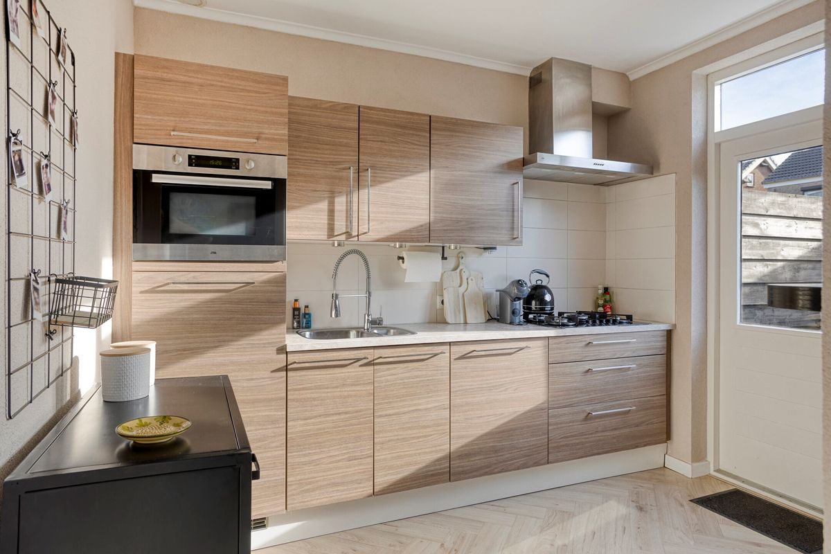 De open keuken biedt veel kastruimte en is uitgerust met een 5-pits gasfornuis, afzuigkap, combi-oven magnetron, nieuwe koelkast (2024) en vaatwasser. Via de loopdeur stap je zo de tuin in.