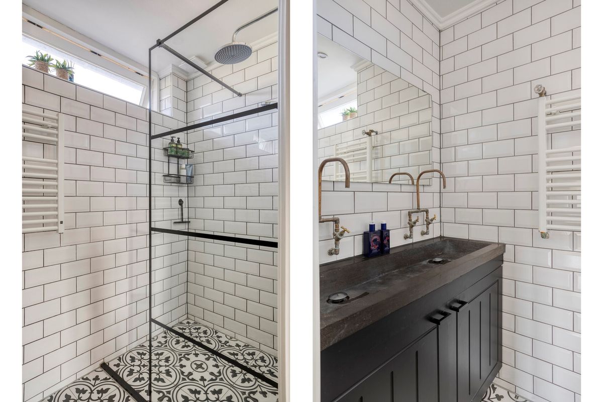 De badkamer heeft een frisse en speelse uitstraling dankzij de volledige betegeling. Je vindt hier een dubbele wastafel, een inloopdouche en een designradiator. De handige waskast met betegelde vloer biedt plek voor wasmachine en droger, lekker praktisch!