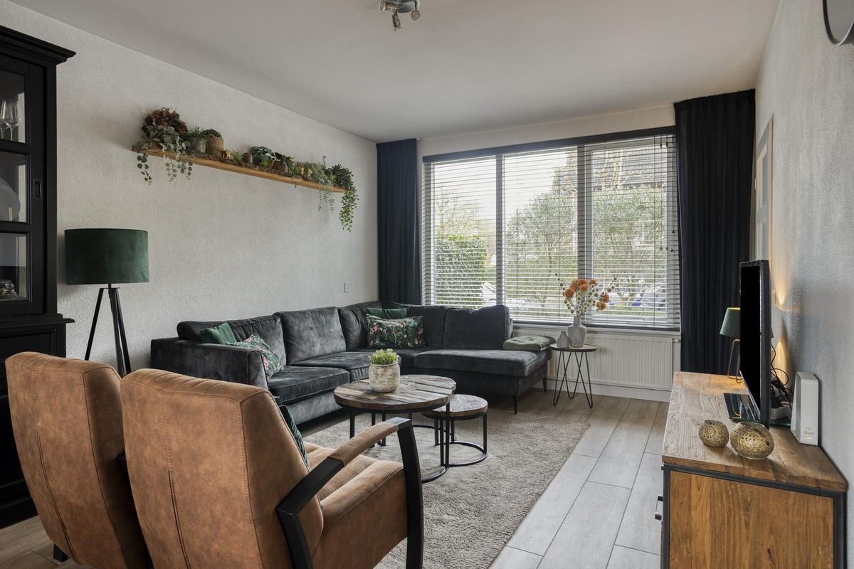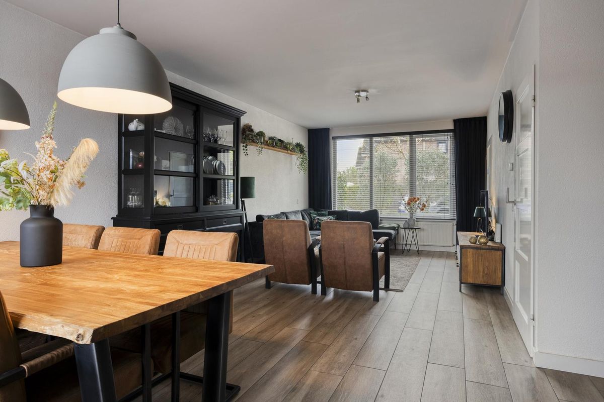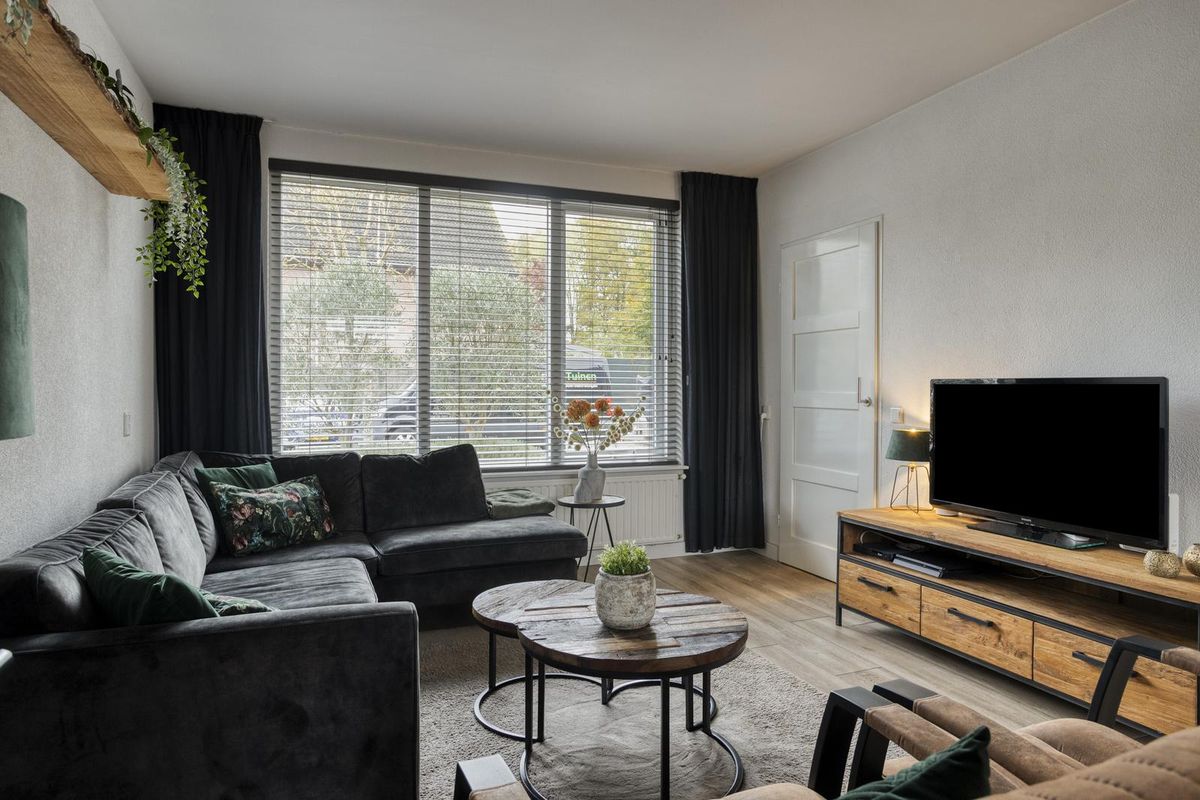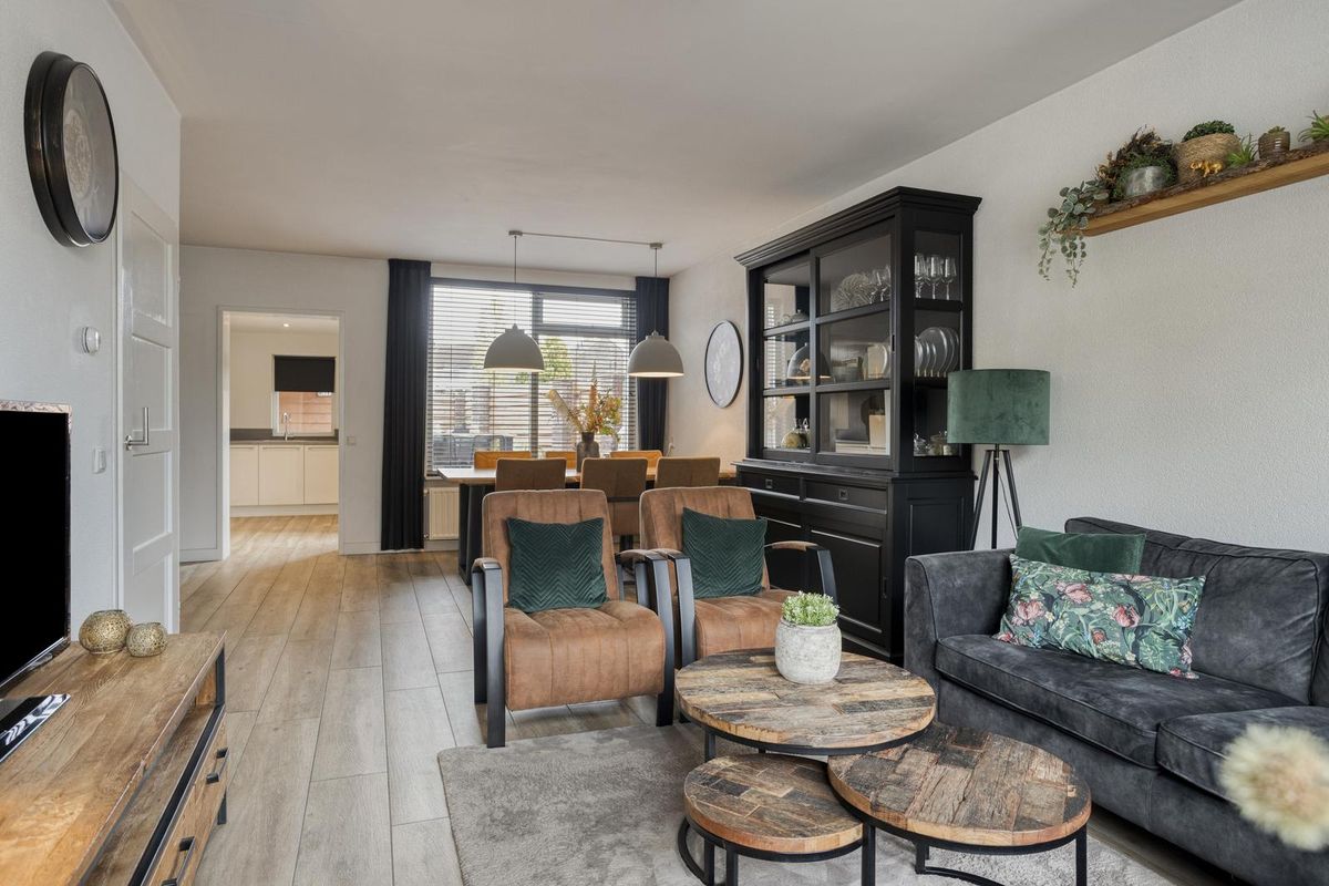 De woonkamer heeft een oppervlakte van 32,4 m² en is afgewerkt met een tegelvloer in houtmotief en hoge witte plinten. De wanden zijn uitgevoerd in spachtelpoets en het plafond is strak gestuct. Aan de voorzijde is ruimte genoeg voor een royale hoekbank met extra zitplekken bij de tv. Aan de achterzijde plaats je met gemak een grote eettafel met zes stoelen — de ideale plek om samen te eten of een spel te doen. Waar vroeger de keuken stond, is nu extra leefruimte ontstaan; de keuken is verplaatst naar de aanbouw.