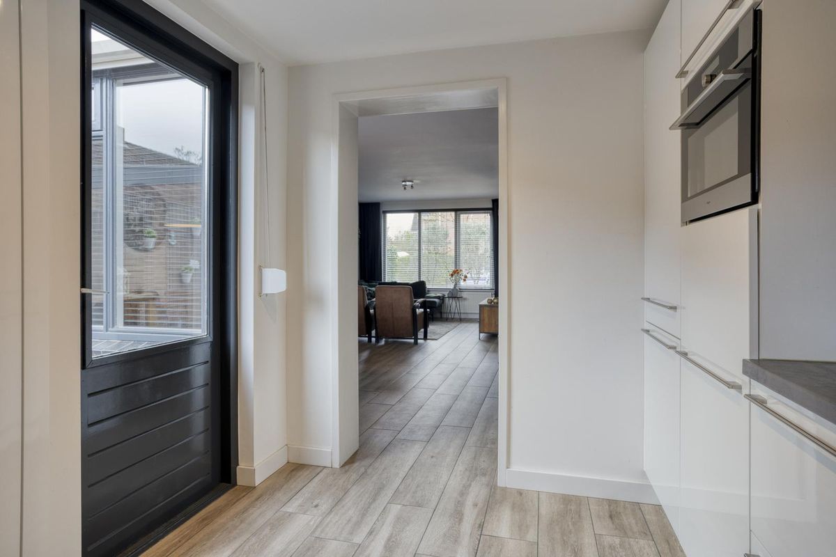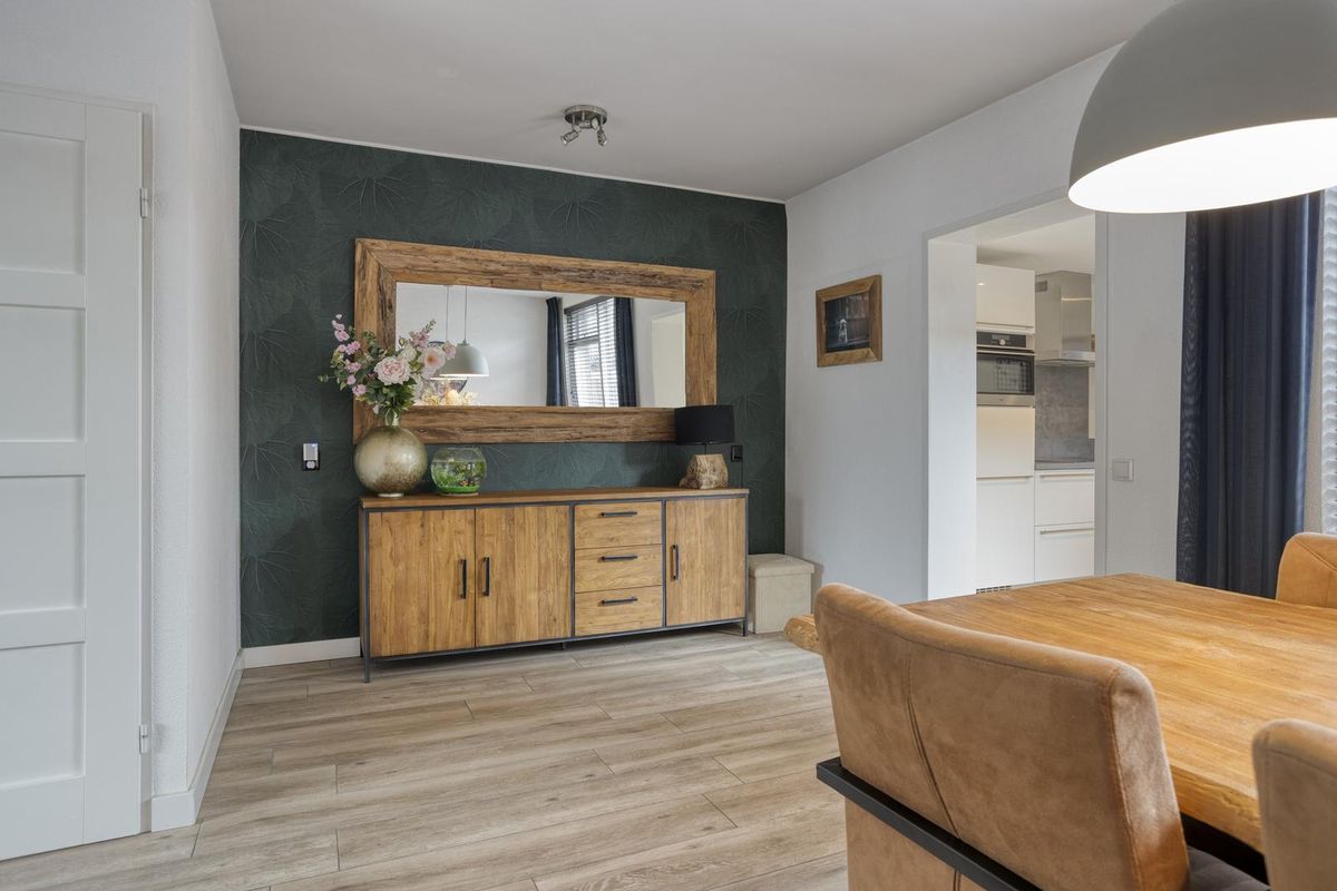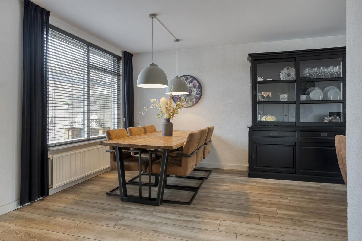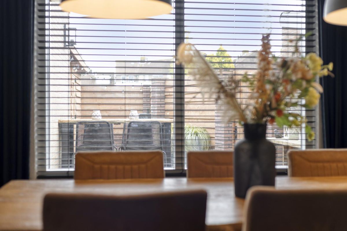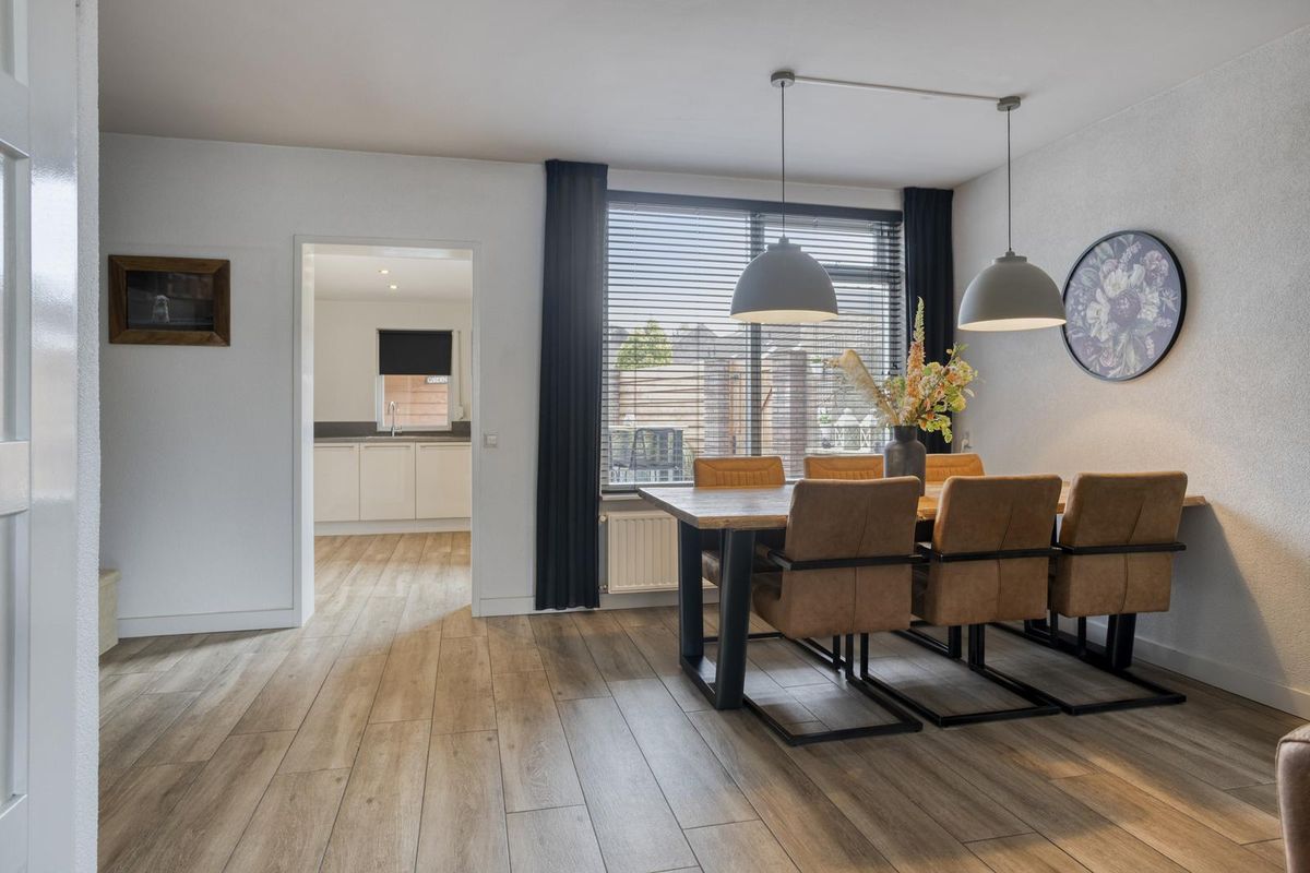 De woonkamer heeft een oppervlakte van 32,4 m² en is afgewerkt met een tegelvloer in houtmotief en hoge witte plinten. De wanden zijn uitgevoerd in spachtelpoets en het plafond is strak gestuct. Aan de voorzijde is ruimte genoeg voor een royale hoekbank met extra zitplekken bij de tv. Aan de achterzijde plaats je met gemak een grote eettafel met zes stoelen — de ideale plek om samen te eten of een spel te doen. Waar vroeger de keuken stond, is nu extra leefruimte ontstaan; de keuken is verplaatst naar de aanbouw.
