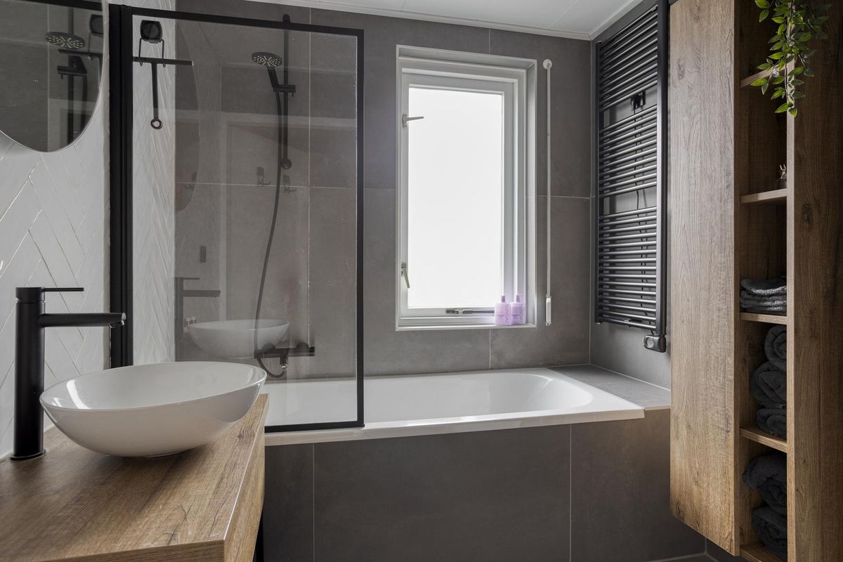 De badkamer van 2,09 m breed en 2,35 m diep is stijlvol afgewerkt met lichte tegels en voorzien van een badkamermeubel met waskom, kraan en spiegel, een ligbad met douchemogelijkheid, een designradiator en een zwevend toilet. De inbouwspotjes in het plafond zorgen voor een moderne uitstraling.