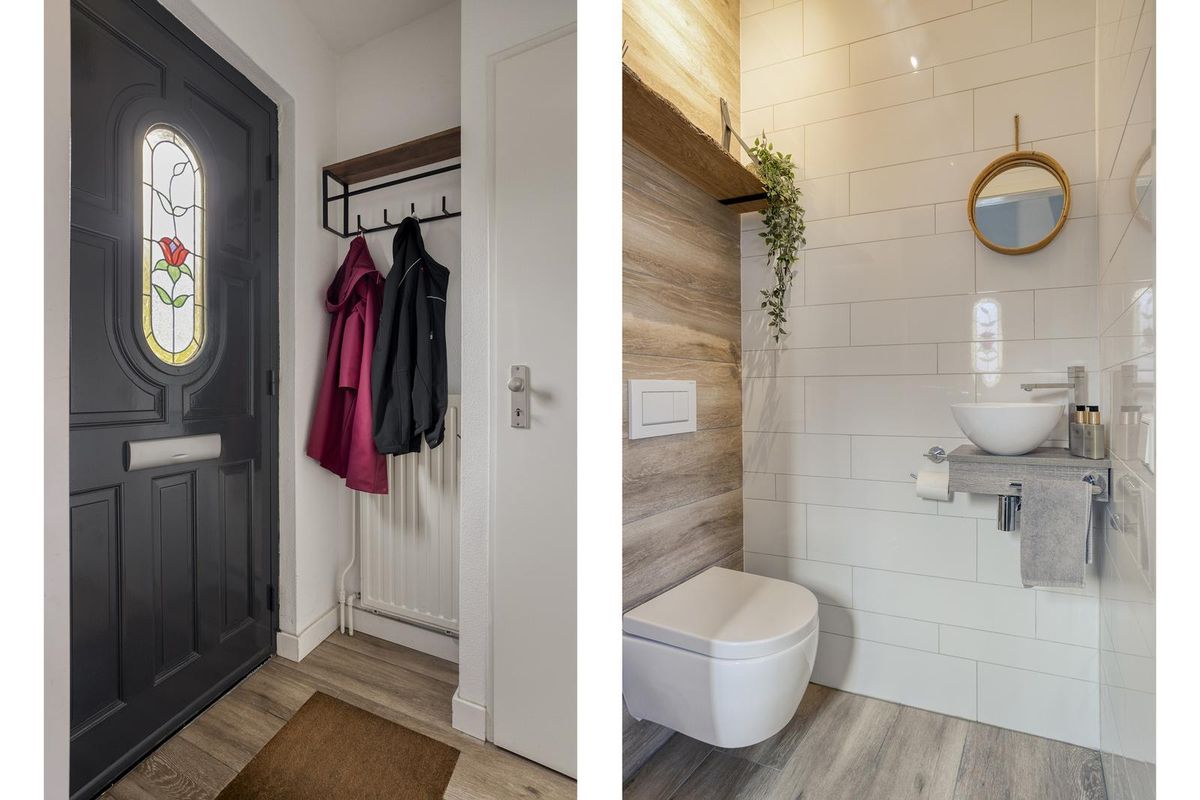 Je parkeert hier gewoon voor de deur, in één van de parkeervakken. Via de onderhoudsvriendelijke voortuin loop je naar binnen in de hal met meterkast, toilet en toegang tot de woonkamer. De meterkast is uitgerust met 9 groepen, 2 aardlekschakelaars en slimme meters voor zowel elektra als gas. In de hal ligt een tegelvloer die mooi doorloopt in het toilet en de woonkamer. Het toilet is voorzien van een zwevend closet en een waskom; wanden en vloer zijn keurig betegeld en het plafond is strak gestuct.