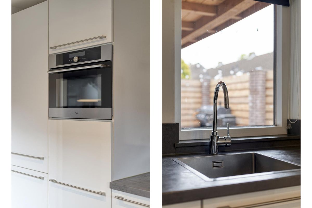 De keuken meet 3,49 m diep en 2,52 m breed en heeft een oppervlakte van 8,5 m². De hoekopstelling is voorzien van alle gemakken: een koelkast, combi-oven, vierpits inductiekookplaat, afzuigkap, vaatwasser en spoelbak. In één van de keukenkastjes hangt de HR-combiketel uit 2025 — keurig weggewerkt, maar goed bereikbaar voor onderhoud.