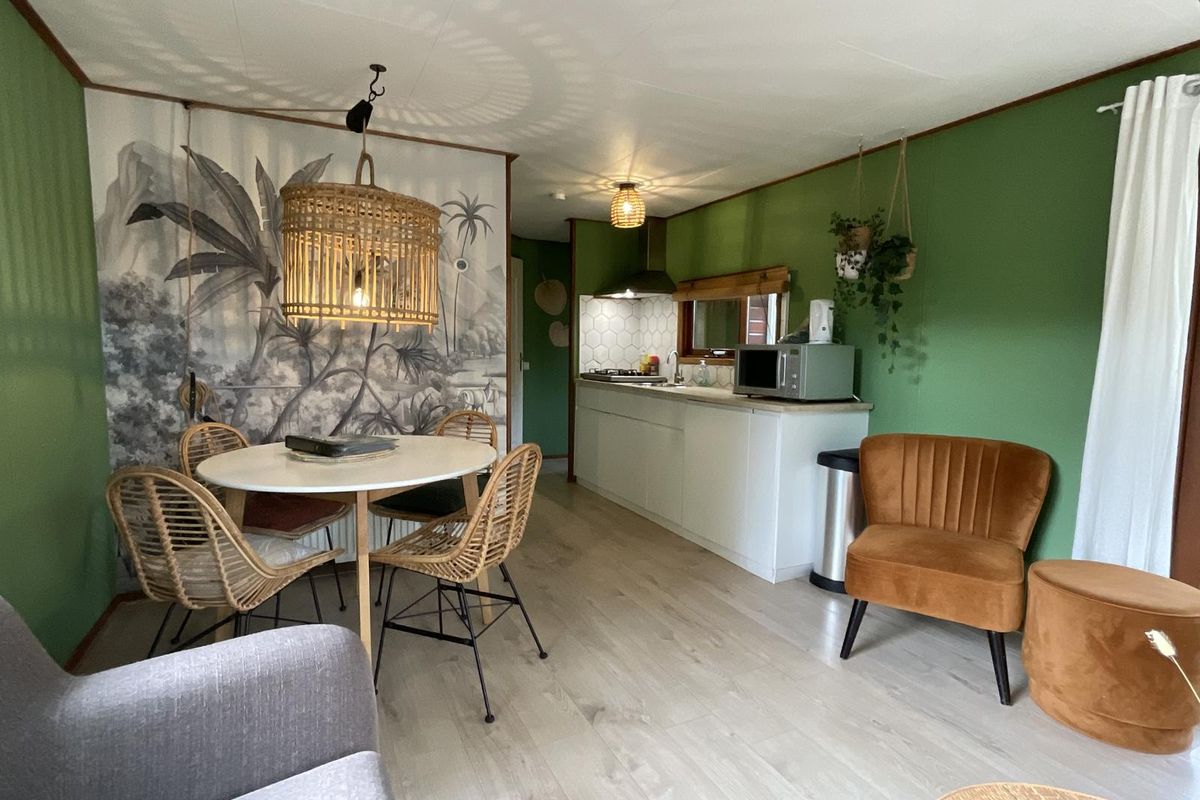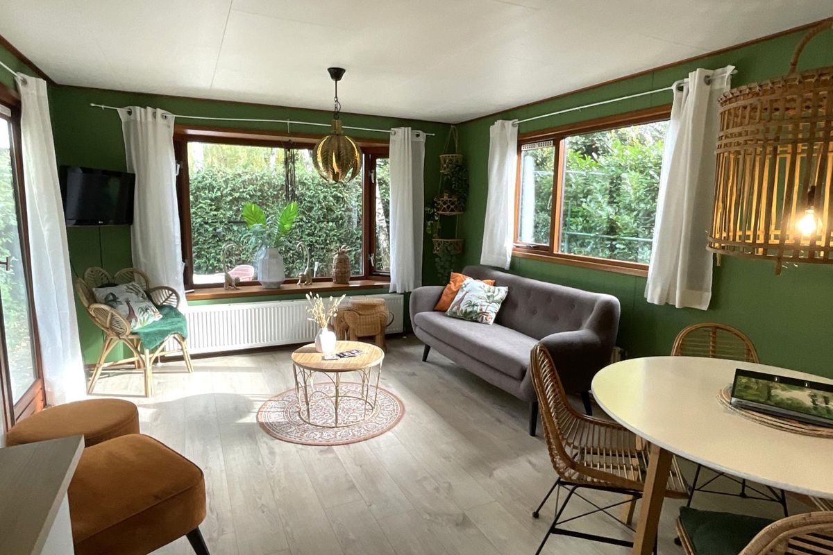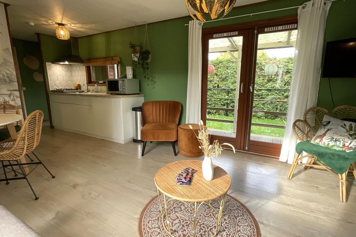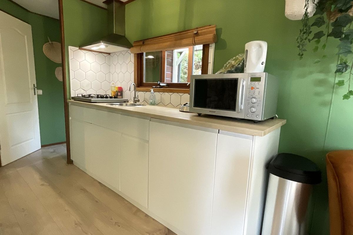 Indeling: Bij binnenkomst via de hal heeft u toegang tot de verschillende vertrekken. De woonkamer is licht en sfeervol dankzij de vele ramen rondom, die een prachtig uitzicht bieden op het groen van de tuin. De erker aan de voorzijde zorgt voor extra lichtinval en maakt deze ruimte bijzonder ruimtelijk. De wanden zijn uitgevoerd in een warme groentint, wat het chalet een knusse en natuurlijke uitstraling geeft die mooi aansluit bij de bosrijke omgeving. Vanuit de woonkamer leiden openslaande deuren naar het verhoogde terras met overkapping. Hier kunt u in alle rust genieten van de buitenlucht, ook op minder zonnige dagen. De overkapping biedt schaduw in de zomer en beschutting bij regen, waardoor dit terras het hele jaar door een heerlijke plek is om te ontspannen. De open keuken is praktisch ingedeeld en voorzien van een gaskookplaat, spoelbak met mengkraan, koel-vriescombinatie en diverse boven- en onderkasten voor opbergruimte. De open verbinding met de woonkamer maakt het een gezellige leefruimte waar koken, eten en samenzijn samenkomen. Het chalet beschikt over één slaapkamer met een kast en ruimte voor een tweepersoonsbed. De badkamer is functioneel, voorzien van een douchecabine en wastafel. Het toilet is separaat van de badkamer geplaatst, wat extra comfort biedt.