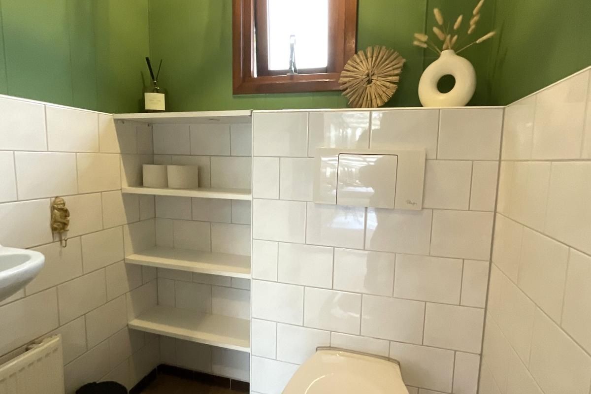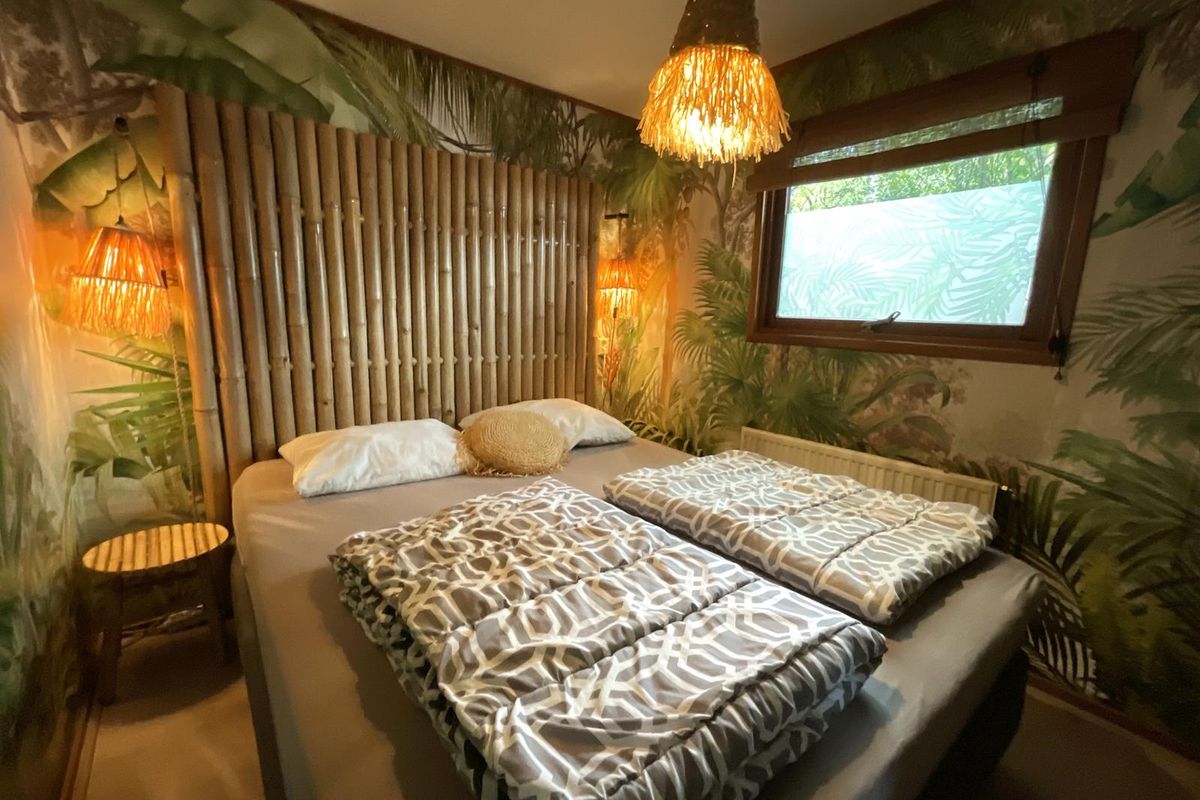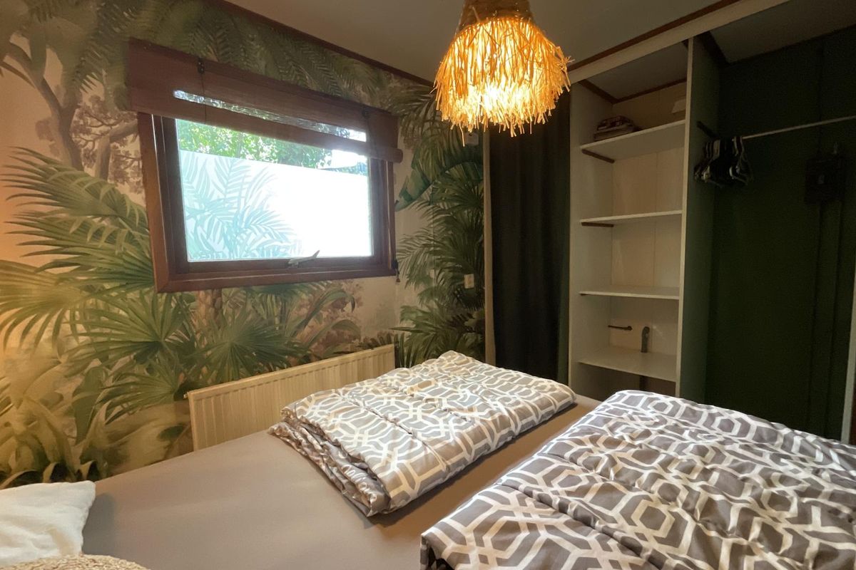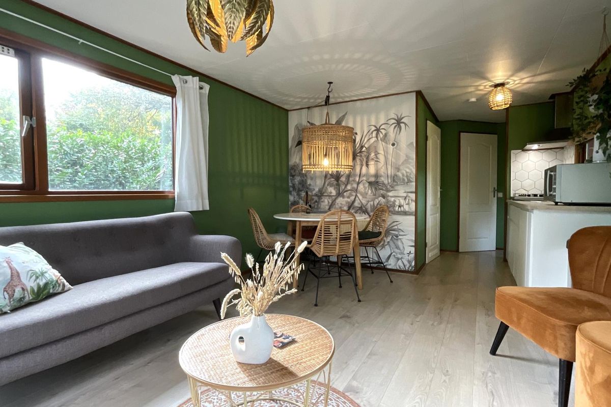 Indeling: Bij binnenkomst via de hal heeft u toegang tot de verschillende vertrekken. De woonkamer is licht en sfeervol dankzij de vele ramen rondom, die een prachtig uitzicht bieden op het groen van de tuin. De erker aan de voorzijde zorgt voor extra lichtinval en maakt deze ruimte bijzonder ruimtelijk. De wanden zijn uitgevoerd in een warme groentint, wat het chalet een knusse en natuurlijke uitstraling geeft die mooi aansluit bij de bosrijke omgeving. Vanuit de woonkamer leiden openslaande deuren naar het verhoogde terras met overkapping. Hier kunt u in alle rust genieten van de buitenlucht, ook op minder zonnige dagen. De overkapping biedt schaduw in de zomer en beschutting bij regen, waardoor dit terras het hele jaar door een heerlijke plek is om te ontspannen. De open keuken is praktisch ingedeeld en voorzien van een gaskookplaat, spoelbak met mengkraan, koel-vriescombinatie en diverse boven- en onderkasten voor opbergruimte. De open verbinding met de woonkamer maakt het een gezellige leefruimte waar koken, eten en samenzijn samenkomen. Het chalet beschikt over één slaapkamer met een kast en ruimte voor een tweepersoonsbed. De badkamer is functioneel, voorzien van een douchecabine en wastafel. Het toilet is separaat van de badkamer geplaatst, wat extra comfort biedt.