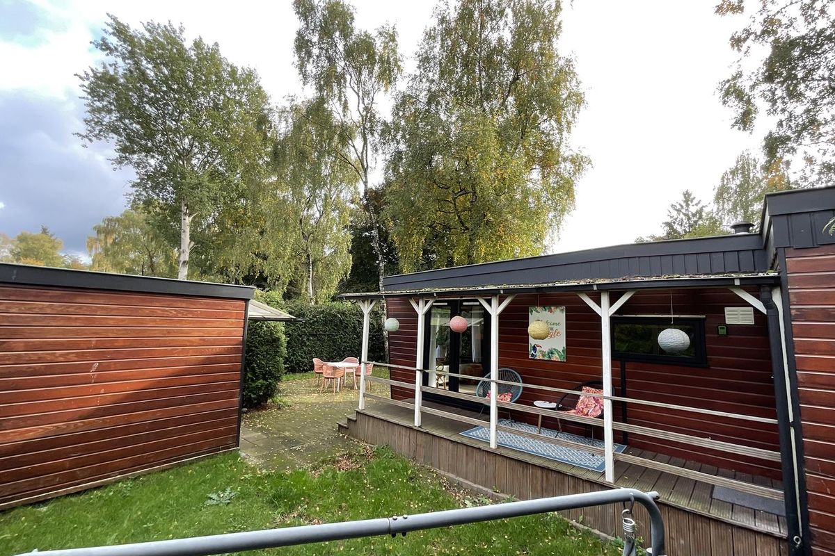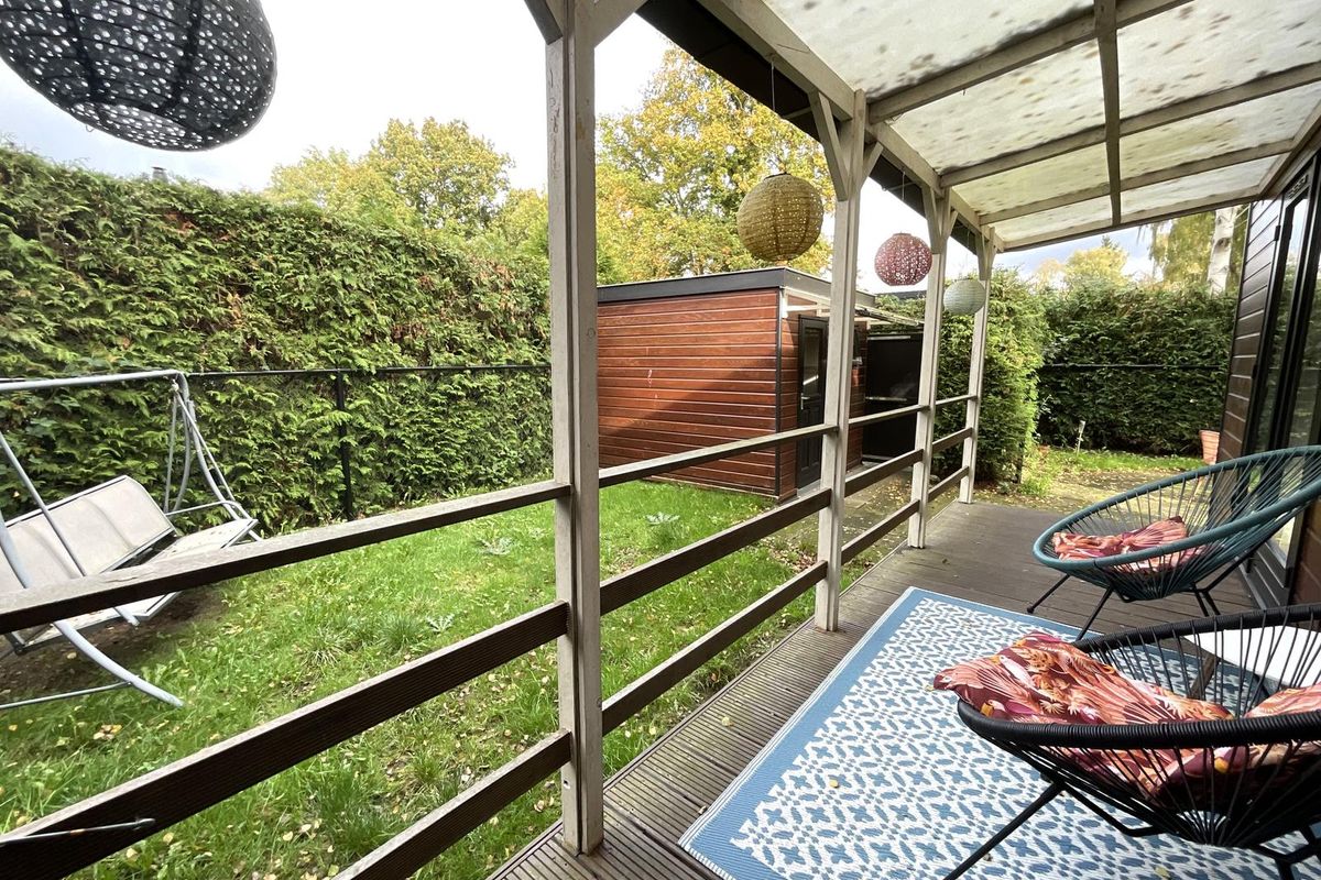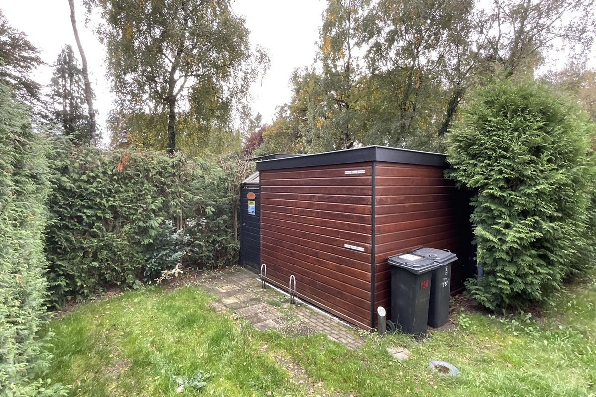 Rondom het chalet ligt een fraai aangelegde tuin met volwassen begroeiing, waardoor u veel privacy ervaart. Er zijn meerdere terrassen en zitplekken gecreëerd, zowel in de zon als in de schaduw, zodat u op elk moment van de dag een fijne plek vindt om te zitten. Aan de zijkant van het perceel bevindt zich een buitenberging, die momenteel deels is ingericht met een bed, waardoor deze ruimte ook kan dienen als extra slaapgelegenheid of logeerkamer. Daarnaast is er nog voldoende bergruimte voor tuinmeubilair, fietsen of gereedschap. Aan de voorzijde van het perceel is er gelegenheid om te parkeren.