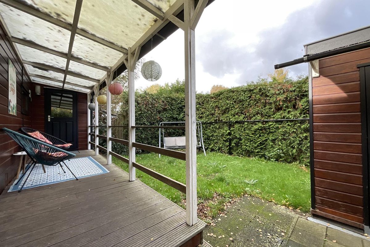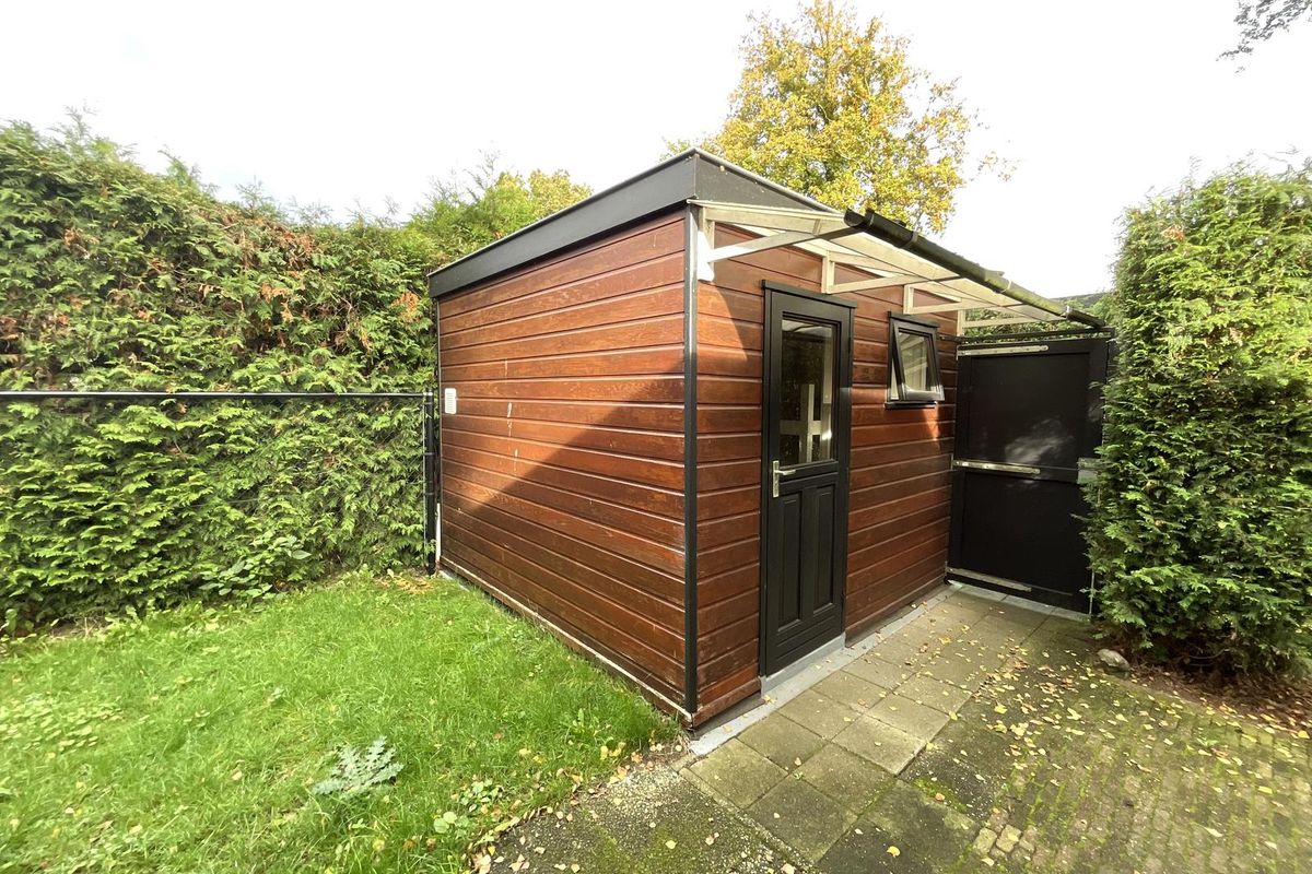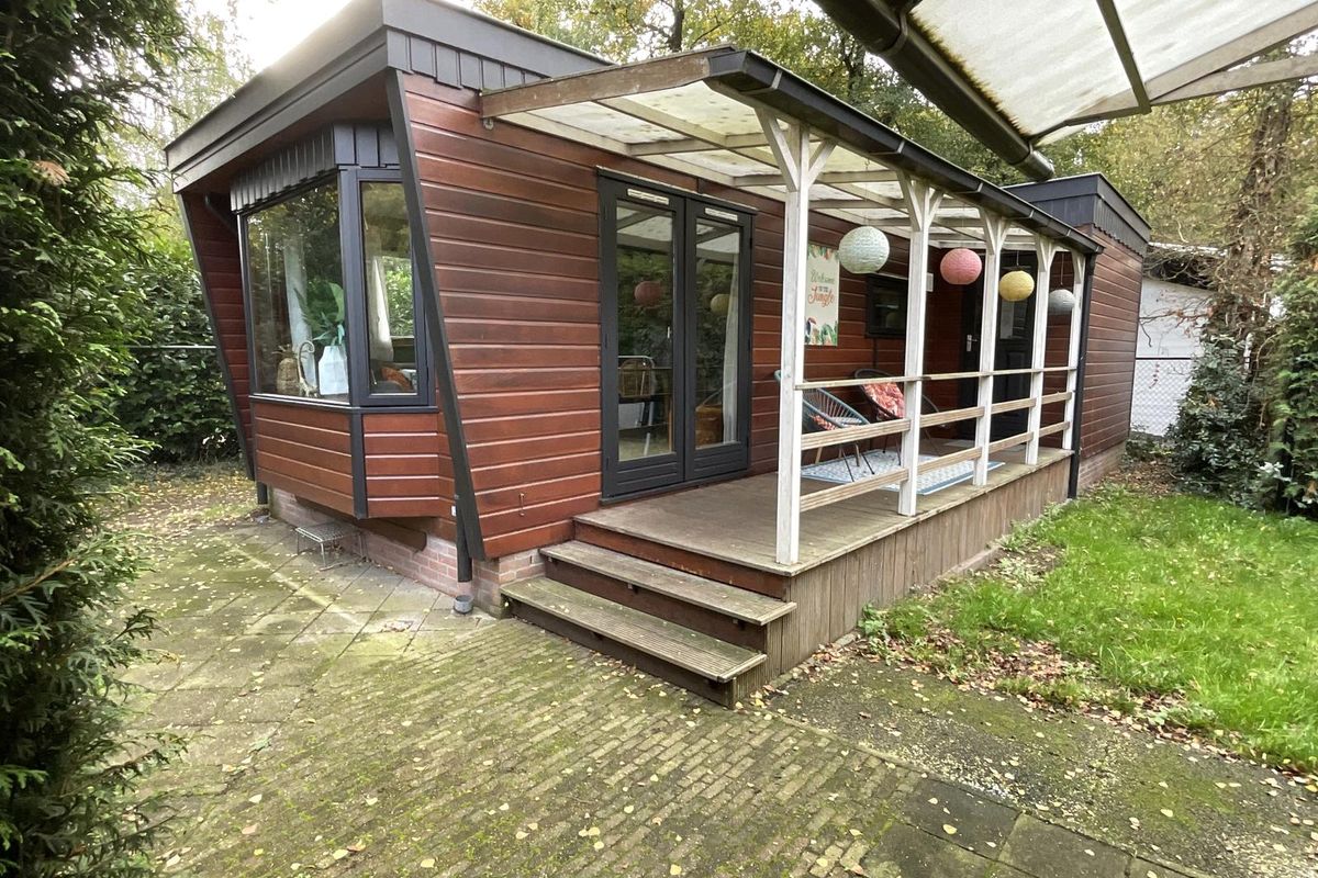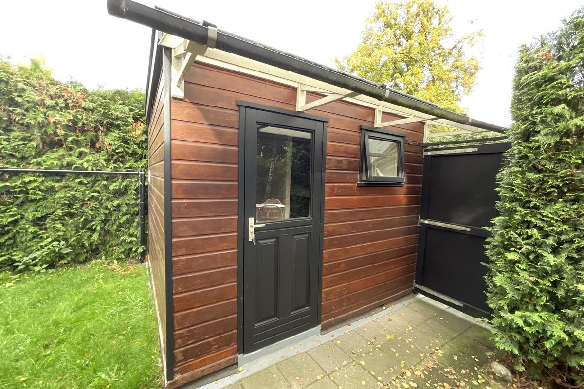 Rondom het chalet ligt een fraai aangelegde tuin met volwassen begroeiing, waardoor u veel privacy ervaart. Er zijn meerdere terrassen en zitplekken gecreëerd, zowel in de zon als in de schaduw, zodat u op elk moment van de dag een fijne plek vindt om te zitten. Aan de zijkant van het perceel bevindt zich een buitenberging, die momenteel deels is ingericht met een bed, waardoor deze ruimte ook kan dienen als extra slaapgelegenheid of logeerkamer. Daarnaast is er nog voldoende bergruimte voor tuinmeubilair, fietsen of gereedschap. Aan de voorzijde van het perceel is er gelegenheid om te parkeren.