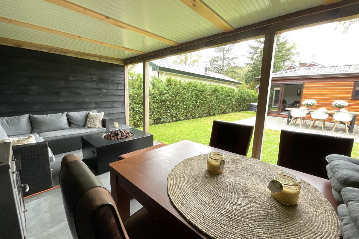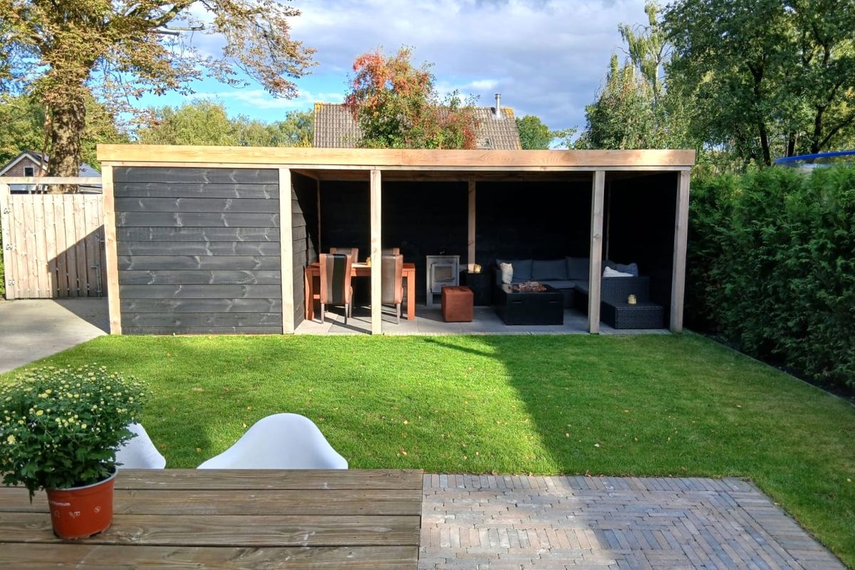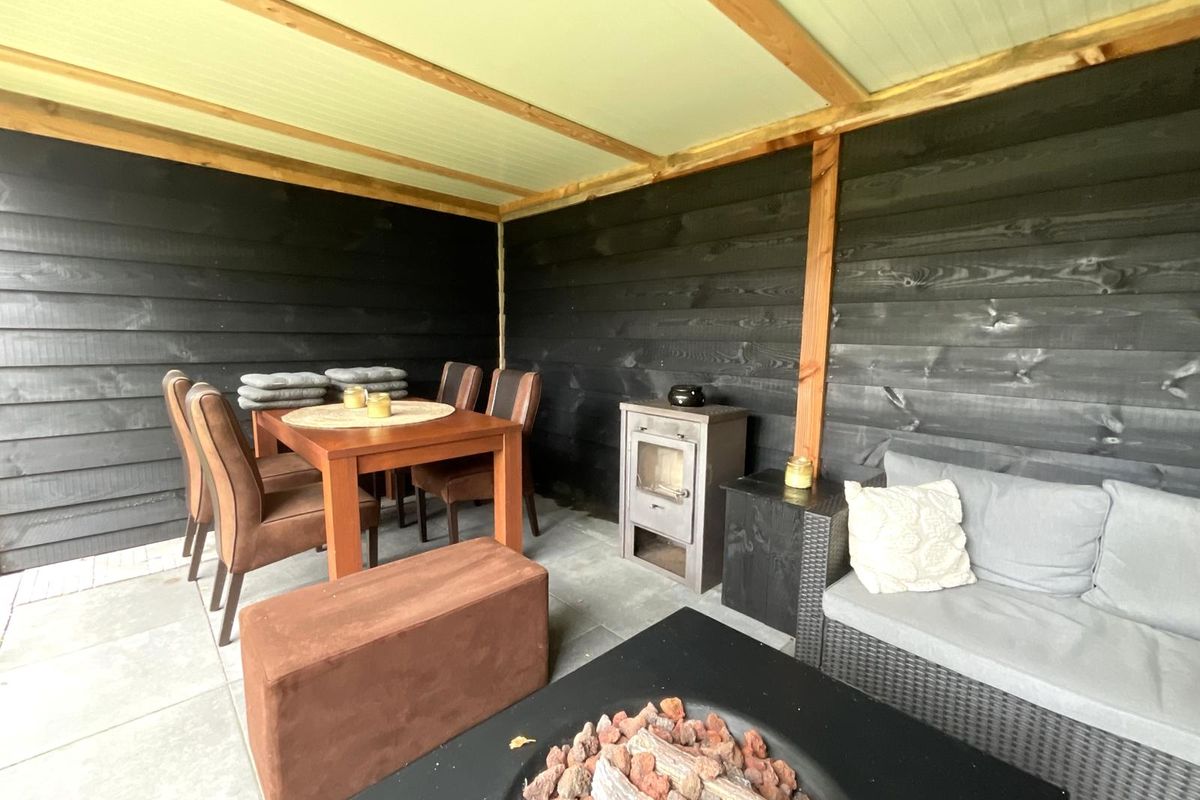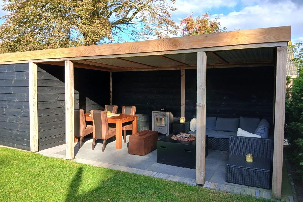 • ruime overkapping met een loungehoek, eethoek en houtkachel