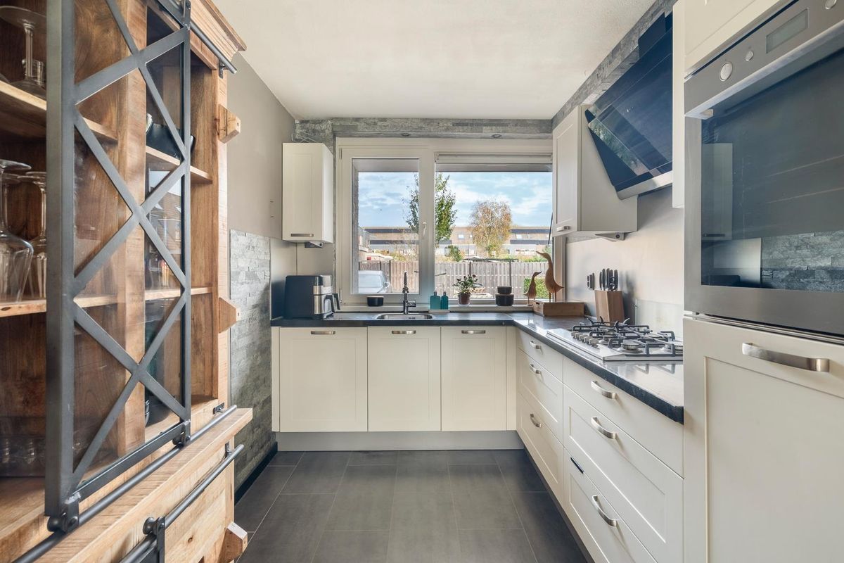 Aan de voorzijde van de woning ligt de nette keuken, voorzien van verschillende (inbouw)apparatuur: koelkast, vaatwasmachine, 5-pits gaskookplaat, afzuigkap en oven.