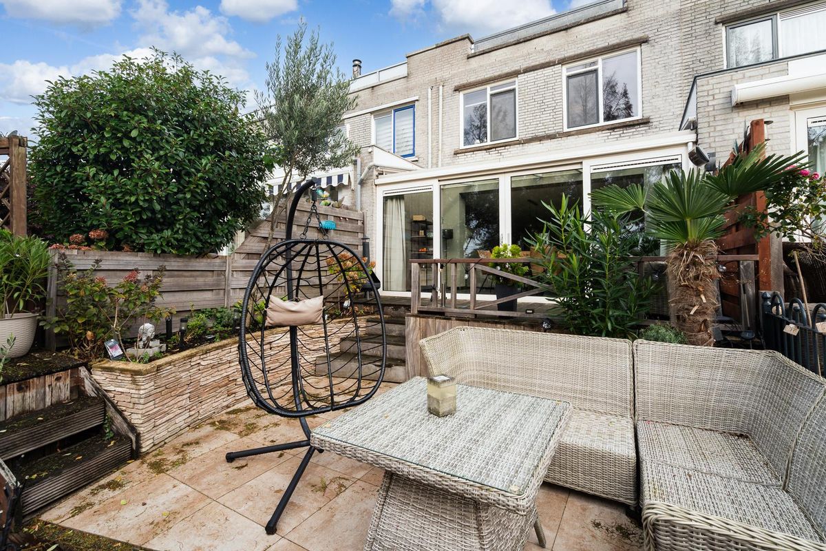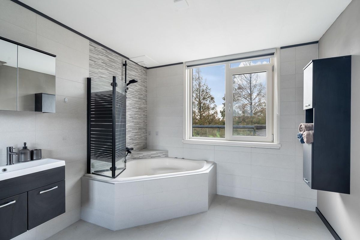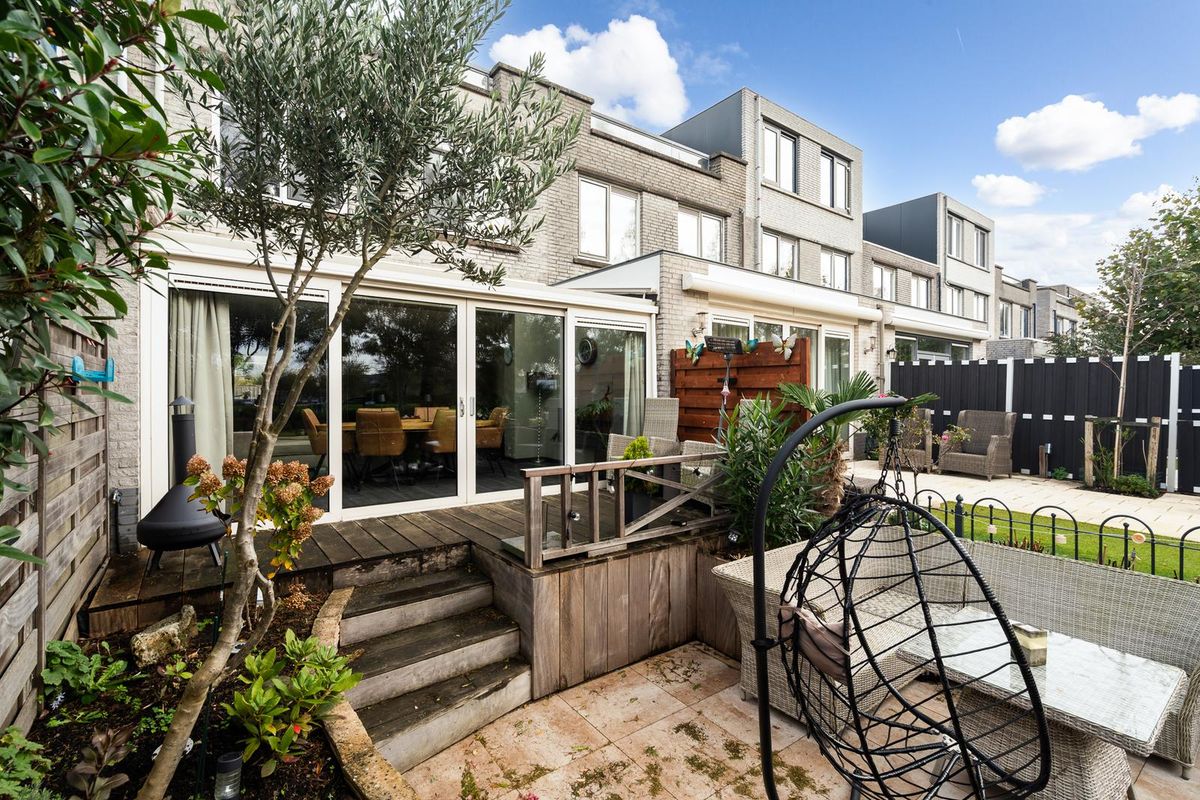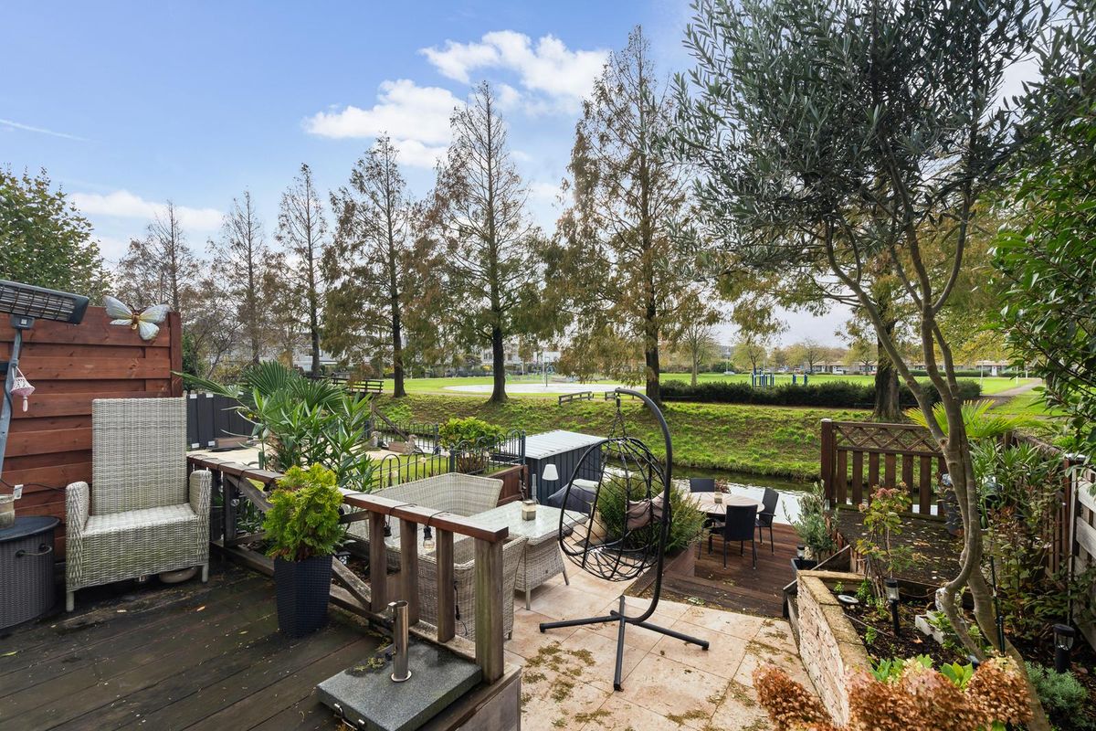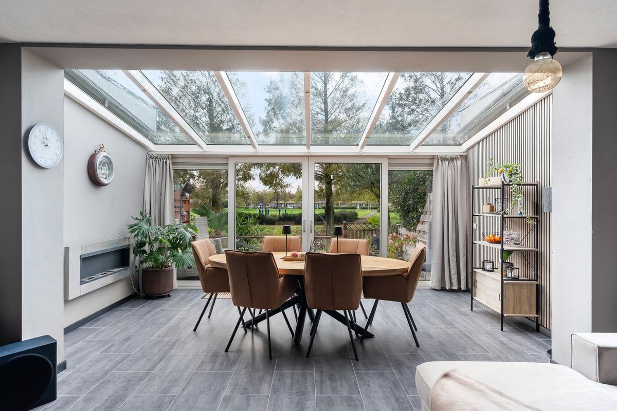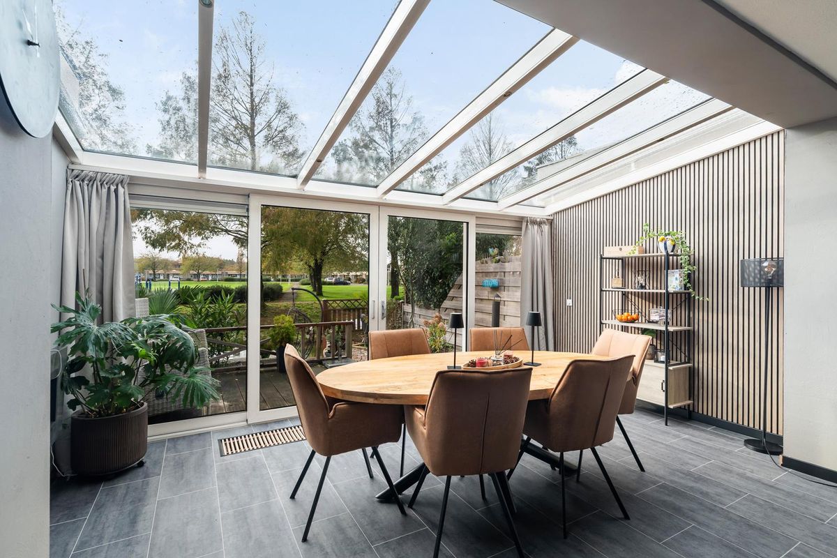 De woonkamer is uitgebouwd met een serre, die voor veel natuurlijke lichtinval zorgt en genoeg ruimte creëert voor een ruim zit- en eetgedeelte. De serre is voorzien van elektrische zonwering met sensor. Via schuifdeuren bereik je de tuin: fraai en speels aangelegd, met deels houten vlonders en deels stenen terras en met een mooie ligging aan het water. Hier kun je heerlijk loungen. De tuin heeft meerdere elektrapunten en een buitenkraan.